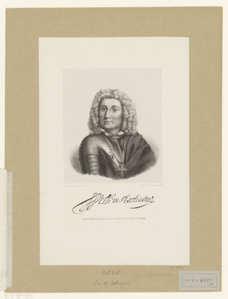Curator: Here we have a portrait, "Portret van Philippe Néricault Destouches," attributed to Joseph Schubert, and thought to originate sometime between 1841 and 1885. It’s currently held here at the Rijksmuseum. Editor: You know, he seems quite pleased with himself. Almost smug. I'd wager he's got a good joke brewing under all those curls. The artist captures a real air of confidence, perhaps a touch of mischief, though it is primarily in shades of grey and white. It's quite small, too, which kind of amplifies that sense of a secret being held close. Curator: Absolutely. The way the artist uses light and shadow certainly adds depth to the character's expression, perhaps to suggest internal thoughts. His pose, while seemingly simple, follows conventions of portraiture—designed to convey respectability and status, which also ties into larger symbols of history. Editor: History loves its wigs! And this one's a masterpiece of curls, rivaling spun gold. But joking aside, notice the subtle folds in his cravat and the sheen on his jacket, it all gives him that...I don't know, 'importance' glow? Yet, is that fabric or water cascading around him? I also like how intimate, small in scale and modest in style the portrait feels in comparison to its academic-historical undertones. Curator: His wig—a periwig—signals belonging to a certain professional and educated class of society in the 18th century. The print captures not just his physical appearance, but also something of his social identity—it's like a signifier of societal belonging. Consider this as a material declaration about the individual and his ties to history. Editor: It’s as though, without all that... that wig, you wouldn't have the Philippe Néricault Destouches we are presented with. Amazing. A bit tragic, a bit comedic, which seems true to the style of theater Philippe was a playwright within. Curator: In looking at this drawing, its careful lines and classical allusions, we perceive more than just a depiction of a person; we engage with how social position was carefully constructed and communicated through visual codes, which ties into understanding this individual’s persona in history. Editor: Well, I think it proves even little drawings can contain whole worlds. Thanks, wig guy. Thanks, artist!