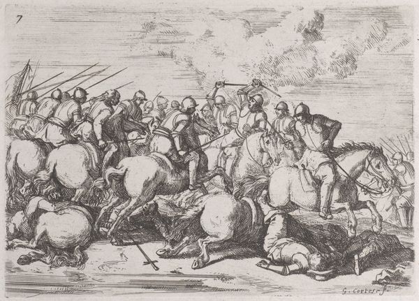 Curator: Today, we’re examining “Plate 4: The Rescuing of Dead and Wounded Soldiers” by Jacques Courtois, created sometime between 1635 and 1660. It’s an etching, currently held at the Metropolitan Museum of Art. My initial response to this is... chaos, but controlled chaos. The lines are so dense, the scene so full of figures, it feels overwhelming. Yet, there's a strange beauty to the composition. Editor: Indeed, Courtois gives us much to unpack here. I think what you perceive as “chaos” is indicative of the realities of war—it’s rarely clean or simple. Note how Courtois places the scene in a broad landscape—emphasizing not just the event of rescuing, but the social and physical world in which violence operates, revealing broader implications regarding the lives and identities of soldiers beyond just combat. Curator: The etching technique lends itself to that, doesn't it? That frenetic energy conveyed through all those cross-hatched lines... It creates a tangible sense of urgency and even…grime. Editor: The artist really highlights the visual language of Baroque. How does this visual strategy work to uphold, perhaps even critique, power structures prevalent in 17th-century military endeavors? The print also asks about social responsibility: Who rescues whom and what narratives do we tell about these actions? Curator: I can certainly see the undercurrents of your interpretation; to my eye the contrast seems somewhat romanticized despite its grim subject matter, perhaps that reading speaks to a desire to find heroism within such scenes of horror. Observe the heroic gesture of those aiding the wounded – Courtois seems to highlight both the fragility of life and resilience amidst destruction. The very act of rescuing emphasizes inherent social and class-based imbalances during that era too. Editor: The work raises such poignant questions about violence, history, and, crucially, human empathy. Curator: It’s true – regardless of perspective it stays with you. An experience more poignant than a heroic painting, perhaps? Editor: It offers something essential, reminding us of the stories and historical conditions we often overlook in larger narratives of warfare.