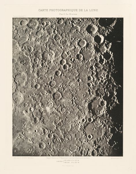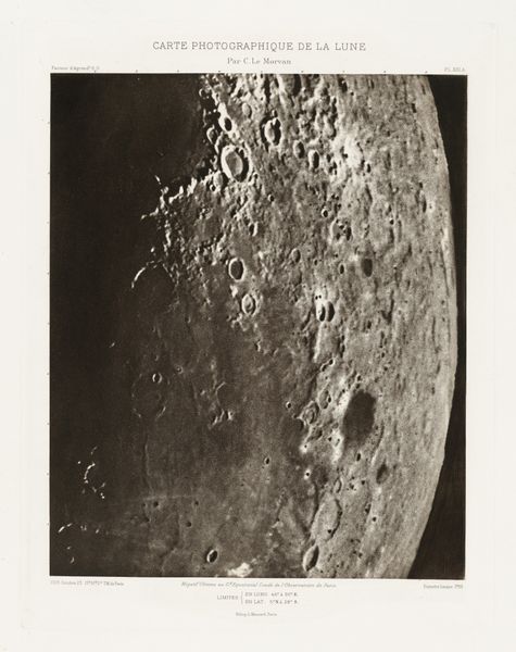 Curator: This compelling gelatin silver print, titled "Lunar Photograph, South Pole," dates back to 1890. It is currently held in the collection of the Metropolitan Museum of Art. Editor: What strikes me immediately is its starkness, the bone-white lunar surface contrasted against the deep, impenetrable black of space. It feels both incredibly intimate and terrifyingly vast. Curator: Well, photographs like this were revolutionary. Think about the scientific and cultural impact – suddenly, we have a realistic depiction of another world, not an artist's rendering. Photography became instrumental in shaping the public's understanding of the cosmos. Editor: Absolutely. And it democratized that understanding. Prior to images like this, celestial knowledge was largely mediated through art or the highly specialized lens of astronomy. But seeing this, it challenges pre-conceived notions about access and what feels unreachable. What kind of statement was the photographer trying to convey about place or belonging in our galaxy? Curator: I believe they wanted simply to record it. However, the act of recording and presenting it, of selecting this particular image and then making it available to public view – that has massive cultural implications. It shapes our relationship to scientific progress and space exploration. Editor: I agree, and I wonder, how do we view our relationship to nature in terms of accessibility and environmental agency? As more photos like this circulate to society, does this create greater empathy or detachment in thinking about preservation? I suppose, regardless, in my opinion this is art serving society at its best, while also revealing its inherent limits. Curator: That is an astute observation; the limits of access and observation remain relevant. Thanks to photographs such as these, we've made great scientific and societal advancements and even re-defined accessibility to the most unimaginable places and realities of our known universe. Editor: Thank you! What a rare photograph that challenges and confronts how one thinks of our agency, our Earth, our lives, and our roles to preserve and question both.