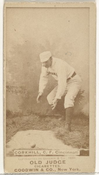 Editor: This is "Frederick B. 'Ned' Jevne, Left Field, Minneapolis," a photograph from the Old Judge series by Goodwin & Company, dating to between 1887 and 1890. What strikes me is its original purpose – an advertisement inserted into cigarette packs. Given its context as an early form of marketing, what significance do you see in these baseball player portraits? Curator: Precisely. The N172 series reveals much about late 19th-century American culture. Think about the burgeoning popularity of baseball, and how companies like Goodwin leveraged this to sell products. How do you think presenting these athletes as stoic heroes might have played into the construction of a specific American identity and its commercialization? Editor: It’s almost like early influencer marketing! So, baseball players became symbols used to promote ideals connected with "Old Judge" cigarettes and that era. Was this image accessible across different classes at the time? Curator: It’s more complex than simple access. Cigarettes were increasingly common, but these cards would've primarily circulated amongst those who could afford them regularly. More critically, examine who *wasn't* represented. Consider how race, class, and gender were implicitly shaping who was considered a hero or worthy of celebration within this emerging commercial culture. This is as much about visibility as it is about absence. Editor: That’s a great point. Thinking about what wasn’t depicted makes me see the image as more than just a baseball card; it reflects social and economic forces at play. Thanks for highlighting that. Curator: It shows how marketing participates in culture building. Now consider the ethical issues arising when advertising aims to sell items by exploiting famous persons and team spirit. It gives food for thought, indeed!