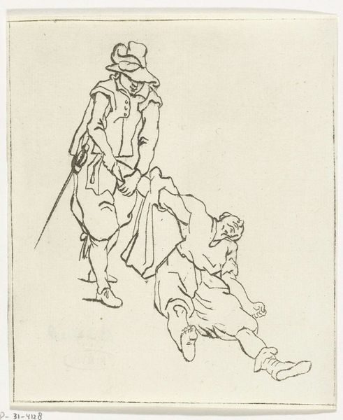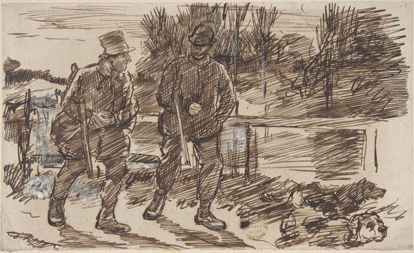 Jan van Essen created this sketch of 'Two Hunters, Standing to the Right' using pen in the late 19th or early 20th century. Van Essen, who lived from 1854 to 1936, captured a moment that reflects the social and economic structures of his time. Hunting was often associated with the upper classes, a leisure activity accessible only to those with the means and social standing. The hunters, with their distinctive attire and pipes, evoke a sense of traditional masculinity. This sketch raises questions about access, privilege, and the ways in which certain identities are constructed and reinforced through cultural practices. The lack of detail invites us to reflect on what we project onto these figures. Are they symbols of a bygone era, or do they reflect ongoing power dynamics in society? This piece provides a window into the historical context of leisure and the performance of social roles.