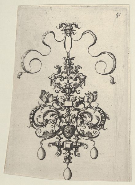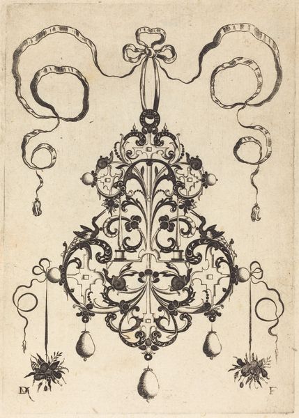 Editor: This intricate engraving, “Vertical Panel with Design for a Pendant,” made between 1595 and 1605 by Paul Birckenhultz, features a vase overflowing with flora. The design feels both ornamental and quite dense. What are your initial thoughts when you see it? Curator: I see the value in examining the materials and labor that went into producing this engraving. How were these prints circulated, and who had access to them? Were they tools for artisans, part of a larger system of production? Editor: That's a fascinating way to approach it. I hadn't considered the print's function in that way. The level of detail makes it feel precious. Do you think it blurs the lines between high art and craft? Curator: Absolutely. In focusing on its function as a design template, we can challenge the established hierarchies of art. The material reality of the print—the ink, the paper, the process of engraving—highlights the labor involved. We must ask, what kind of workshops would use a print like this, and how did its usage reflect social class divisions during the Italian Renaissance? How does understanding that materiality change our perception of it today? Editor: That makes me rethink its purpose completely. Instead of viewing it as solely decorative, I see it as a functional tool within a broader manufacturing context. Curator: Exactly! Understanding the means of production allows us to reassess its place in society, both then and now, and even appreciate it aesthetically. Editor: I appreciate how your approach to this engraving helps it shed the museum "precious" object label, and come to life as a commodity from another era.