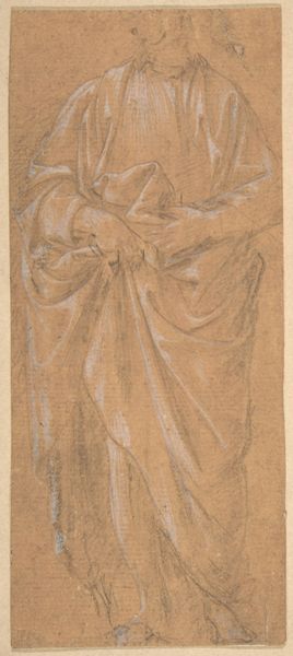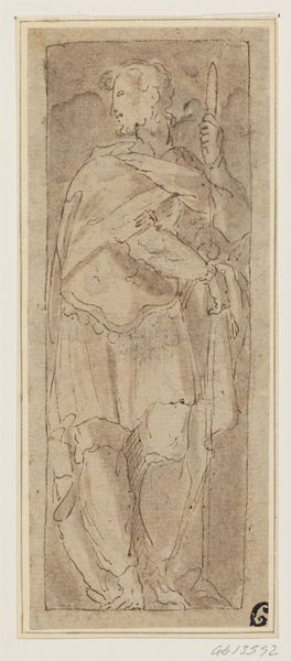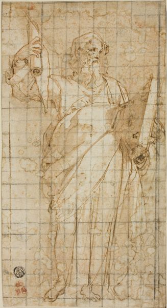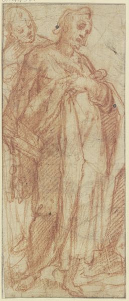Bernardino Poccetti created this drawing, "Standing Female Saint or Nun and an Angel," with pen and ink, sometime between 1548 and 1612. The composition is vertically oriented, dominated by a draped figure on the left, with a smaller, more animated angel on the right. Poccetti’s use of line and shadow creates a sense of depth, even though the figures appear somewhat flattened. The drawing invites us to explore how meaning is constructed through form. The heavy drapery enveloping the saint contrasts with the more delicate lines defining the angel, perhaps symbolizing their differing spiritual states. The hatching and cross-hatching create tonal variations that model the forms and suggest a light source from the upper left, adding volume to the figures. Consider how Poccetti's strategic use of line and shadow invites a reading of the drawing not just as a depiction of a saint and angel but as a study in contrasts—weight versus lightness, stillness versus movement—engaging with the broader artistic concerns of his time.