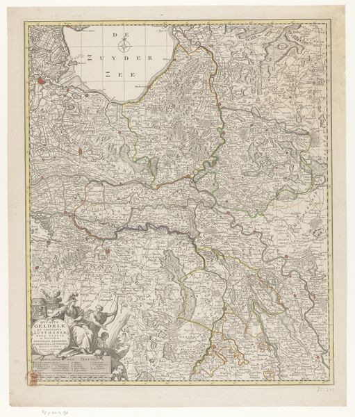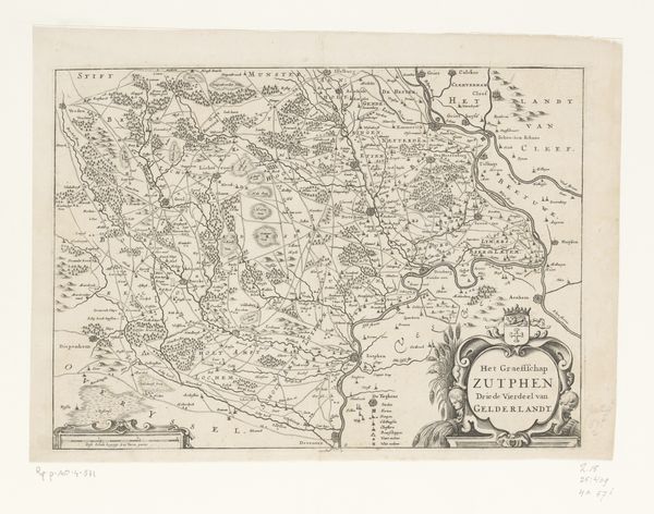 Curator: This is a fascinating engraving, titled "Kaart van de provincie Utrecht," created by Luggert van Anse sometime before 1702. It meticulously maps out the province of Utrecht. Editor: The immediate impression is one of dense detail and precision. Look at the sheer amount of lines packed into a single sheet! It conveys the effort put into understanding and cataloging the landscape. Curator: Precisely. Maps such as this played a key role in solidifying state power. They visualize territorial claims, helping to legitimize governance through the control of spatial knowledge and regulation of natural resources. Who got to decide these lines mattered immensely to marginalized communities. Editor: Agreed, the labor that went into it must have been considerable and, considering it’s an engraving, involving highly skilled work. What's also interesting is how this object, originally functional, transitions into something of artistic value over time. Curator: It's also vital to acknowledge that the artistic choices—what gets emphasized or omitted—are never neutral. Note, for example, the decorative cartouche featuring putti. It connects directly with prevailing power dynamics in that era, intertwining art, labor, class, and access to essential knowledge. Editor: Right. By highlighting the means of production – from surveying techniques to engraving methods - we also have to see how printmaking allowed these concepts of control to be reproduced widely, thus impacting people's understanding of land ownership. Curator: And consider the act of creating this map – what assumptions underpinned Van Anse's perspective, whose vision of Utrecht gets prioritized here? It represents more than just lines on a page. This artifact presents an entire ideological framework shaping perceptions. Editor: Seeing how those perceptions eventually shifted highlights the changing social and environmental realities, as reflected later in artistic practices. It pushes the viewer to ask: "How have the means of visualising a place continued to reinforce certain social norms and political systems throughout art history?" Curator: It challenges us to think deeply not only about maps themselves but rather power structures embedded within every aspect from cartography through our contemporary understanding, acknowledging whose voices remain marginalized when charting any territory throughout our global landscape. Editor: Indeed, through such artifacts, we start exploring links connecting creation to class structures and to broader economic realities affecting its place through society overall; therefore reflecting a tangible connection binding people within labor beyond purely illustrative intentions alone.