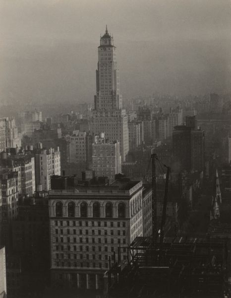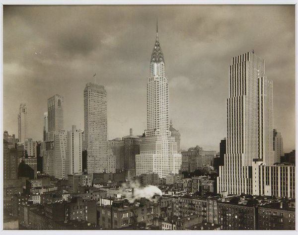 Curator: Immediately, I’m struck by the density. The way the buildings seem to breathe and fight for space. Editor: This is Alfred Stieglitz’s photograph, “New York from 405 East 54th Street,” taken between 1936 and 1937. What draws your eye? Curator: The relationship between the Chrysler and Empire State buildings. They almost seem to converse with one another. The Chrysler, ornate and earlier, set against the stripped down, perhaps more powerful, Empire State Building. This contrast seems quite revealing. Editor: Reveal what, precisely? Stieglitz made a conscious choice of vantage point. I wonder about the labor, the construction, and even the ownership involved in these imposing structures. Whose city is it really? Curator: Ah, there it is. But it feels bigger, no? I am thinking about class, about how architectural space encodes access. You can consider these monuments as phallic symbols, but I see them more as indicators of power struggles in a pre-war era. How does this architectural image frame these hierarchies? How does it obscure labour by glorifying these skyscrapers? Editor: I see your point regarding architectural narratives and obscured labor. What truly captivates me is the tangible texture that Stieglitz captures. He brings forward questions about production, not just whose bodies were involved in the construction, but who will occupy the spaces? Curator: Agreed. We need to remember how even photographic printing, specifically the processes of modernist photographers like Stieglitz, impacted our perception and construction of truth in the city, then and now. Editor: Photography and concrete are materials inextricably linked to ideas of progress. Ultimately this work invites viewers to look past the beauty to observe the material processes that built both the structures and our perception of them. Curator: And beyond that, how our own perceptions are influenced by what we inherit from a past mediated by technology and power structures.