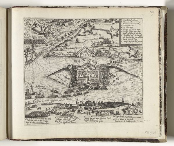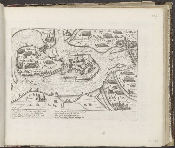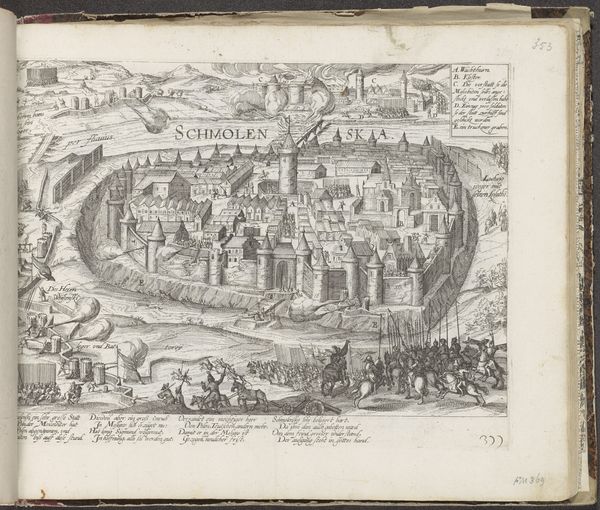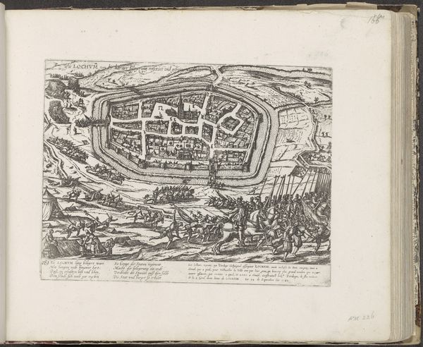Editor: So, this is Frans Hogenberg’s “Verovering van Hülchrath, 1583,” made between 1587 and 1591. It's a print, currently held at the Rijksmuseum. It looks incredibly detailed, almost like a map come to life, but with soldiers. What strikes you most about this piece? Curator: The print offers a fascinating window into the socio-political landscape of the late 16th century. Hogenberg isn't just showing us a battle; he's constructing a narrative, a visual account shaped by the Dutch Revolt against Spanish rule. How do you think this image would have functioned as propaganda? Editor: I can see that! The detail almost makes it seem objective, even though it clearly picks a side. So the level of detail is persuasive rather than simply descriptive. Do you think this kind of historical imagery played a role in shaping public opinion at the time? Curator: Absolutely. Prints like this were circulated widely, offering a potent means of shaping public perception. Think about it: news travelled slowly. Images became powerful tools for constructing collective memory and national identity. The siege of Hülchrath, meticulously documented, becomes a symbol in a larger struggle for freedom. Do you notice anything about the way space is used in the image? Editor: Now that you mention it, the bird's eye perspective kind of flattens everything, almost like it is showcasing the inevitability of Dutch triumph. Also, I just noticed how small the local inhabitants appear! I never really considered how an image's point of view might reflect social biases. Curator: Precisely. Hogenberg's choices – the viewpoint, the scale, even the inclusion of that text at the bottom – all contribute to a particular reading of the event. Considering such elements opens up a wider perspective on the period’s worldview. Editor: This makes me think differently about art history; how the socio-political climate could be weaved so skillfully within the artwork! Thanks for your insight. Curator: My pleasure! It’s a reminder that art doesn't just reflect history; it actively participates in its creation.
