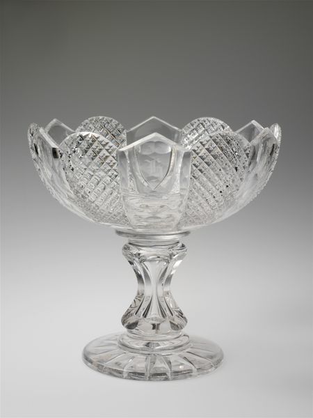 Editor: Standing here, gazing at this late 19th-century punch bowl, made of cut glass and credited to an anonymous maker, I am struck by the incredible skill it must have taken to create this dazzling object. Its intricacy really sparkles. What can you tell me about its historical context and how it was perceived at the time? Curator: Well, during the late 19th century, we saw what some might describe as an explosion of decorative arts, fueled by industrialization. Objects like this punch bowl became potent symbols of prosperity and social standing. This piece, in particular, embodies a culture eager to display newly acquired wealth, as intricate cut glass involved costly raw materials and specialized craftsmanship, rendering such pieces very visible signifiers of social status and privilege. Editor: So, owning a punch bowl like this was more about showing off than, say, a deep appreciation for glass art? Curator: Precisely! These weren't simply utilitarian objects. The creation and public display of these meticulously crafted items happened because industrial manufacturing gave rise to disposable income across more segments of the population. So this seemingly innocuous punchbowl represents social aspirations, and the politics of wealth on display in late 19th century America. What do you notice about its design? Does anything stand out to you beyond its inherent shininess? Editor: I guess now that you mention the politics of wealth, I wonder who exactly was benefitting from that labor. Was this craft limited to a select few artisans, or was the opportunity more widespread? It certainly shifts my perception of the piece, thinking about the people involved. Curator: That's exactly the right question to ask. It highlights the social and labor histories often hidden within these beautiful objects. Thinking about it that way certainly does impact our relationship with this artifact, doesn’t it? Editor: It absolutely does! Thanks for shedding light on all that, I will think differently about this from now on.