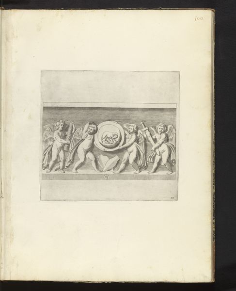 Curator: Welcome. We're looking at a print titled "Bas-reliëf met putti," or "Bas-relief with putti" made between 1636 and 1647 by Pieter de Bailliu. It resides here in the Rijksmuseum collection. Editor: Immediately, I'm struck by its rather playful, almost frivolous character. It has the texture of aged parchment, with an exquisitely light touch to each line. The artist coaxes depth and form with the most subtle shifts in tone, wouldn’t you agree? Curator: Certainly. Look closely at the composition; observe the arrangement of the putti and their placement within the architectural setting. The linear quality creates depth and highlights the sculptural nature of the design itself, playing with relief. It echoes classical form, mediated through the Baroque interest in ornamentation and detail. Editor: It reminds me of academic exercises. What does the imagery communicate? Are these merely chubby children, or do they evoke a deeper symbolism, such as love, innocence, or the cycle of life as traditionally interpreted? This feels complicit, in some ways, with a worldview privileging leisure and the aestheticization of existence, when considering its time. Curator: I’d say that is too simplistic. Notice how Bailliu manipulates light and shadow to emphasize certain forms, drawing the eye to moments of tension or resolution within the composition. The very execution in print form transforms something classically conceived of as high art into something replicable and widely available for study. The linear design emphasizes clarity and precision. Editor: But who had access to it? I appreciate your pointing to formal concerns, of course. However, understanding the work also requires situating it within social hierarchies. Did it only function to naturalize systems of power? To instruct? It begs further inquiry into its complex cultural encoding as it circulates. Curator: Perhaps. The interplay between form and function generates multiple interpretations, from a purely aesthetic appreciation of line and form to deeper reflections on its content. In the end, this work's elegance invites scrutiny from various standpoints. Editor: Absolutely. Analyzing its legacy by bridging history and critical theory is key to understanding how art of the past still has impact today. Thank you.
