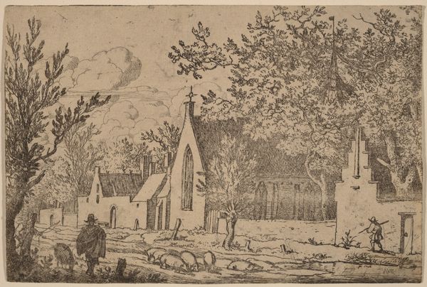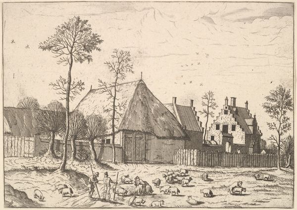 Curator: Before us, we have "Village Road, plate 3 from 'Regiunculae et Villae Aliquot Ducatus Brabantiae,'" an engraving by Claes Jansz. Visscher, dating roughly from 1605 to 1615. Editor: It’s incredibly detailed! There’s a tangible sense of rustic simplicity. You can almost feel the grit of the road beneath your feet and smell the hay drying on those roofs. Curator: The print belongs to a series showcasing rural scenes, which places it within the historical context of a shifting relationship with land. Think of the rising merchant class, land ownership, and nascent capitalism shaping artistic representations of the countryside. Editor: Absolutely. Looking closely, one sees the meticulous labour involved in crafting such an intricate image using the engraver's tools and craft knowledge. Each line represents countless hours of work—it speaks of a dedication to documenting the landscape in an age before photography. How interesting that he decided to produce several images to become a series! It feels like documentation labor. Curator: That's precisely it. Consider, too, the socio-economic status of those depicted here. The scene likely represents the lives of tenant farmers or labourers; their stories become visible, if only in the margins, resisting a purely idyllic interpretation of the landscape. Their toil made those wealthy dutch landscapes real, their relationship to ownership being represented there as absent. Editor: And there's the matter of consumption. Who was buying and viewing these prints? Wealthy merchants who would have these hung in their homes? And, therefore, reinforcing a very specific lens by which these people were seen? Curator: A key point. These prints potentially catered to an urban elite keen to consume idealized images of the countryside, reflecting, perhaps, a romanticized notion of rural life in contrast to their own lived experiences in the burgeoning cities. The image, in this light, is a form of cultural capital. Editor: Indeed, the materiality of the print itself—the paper, the ink—speaks to broader economic structures and networks of trade within the Dutch Golden Age. The materials were just another important component of it! Curator: It truly makes you consider the labour of landscape in relation to the Dutch economy and the colonial powers abroad and back home. It speaks to the many intersectional relations involved. Editor: The engraving prompts a further exploration into the means of its own making and its place in the domestic economy, an exploration into craft and materiality.
