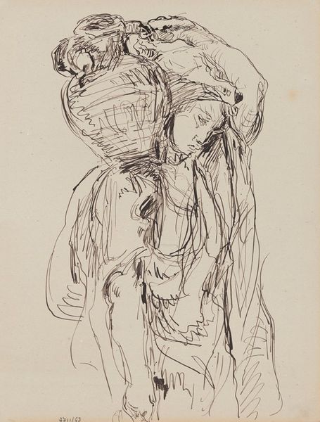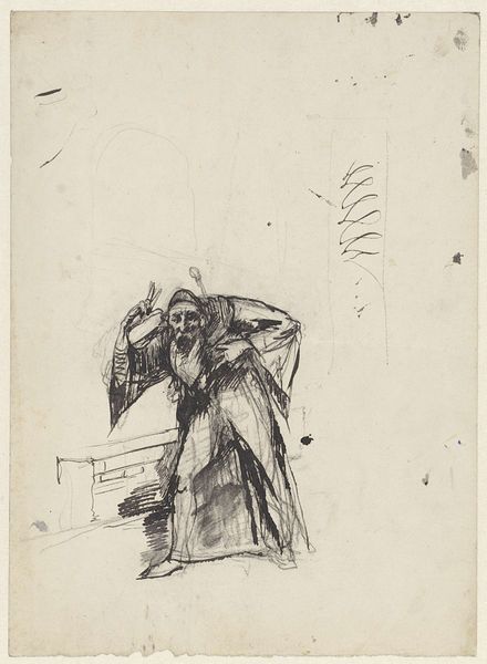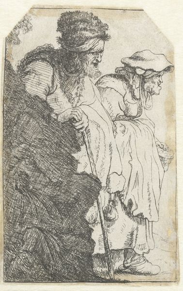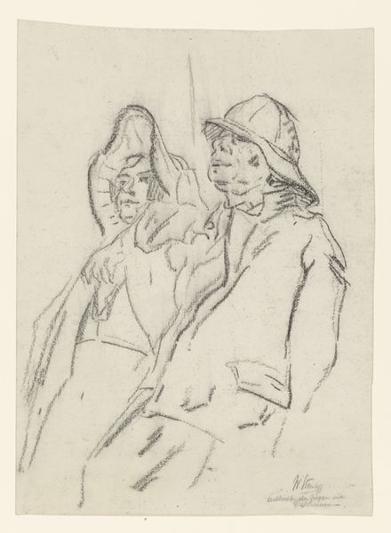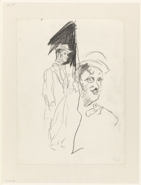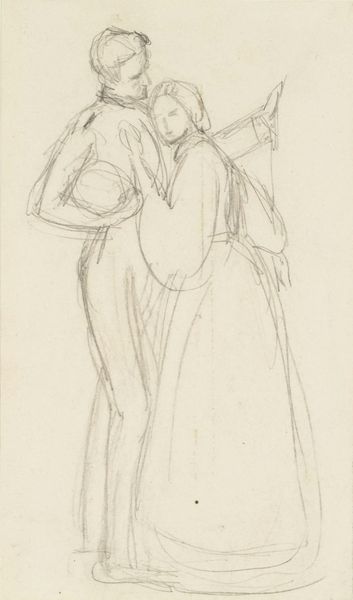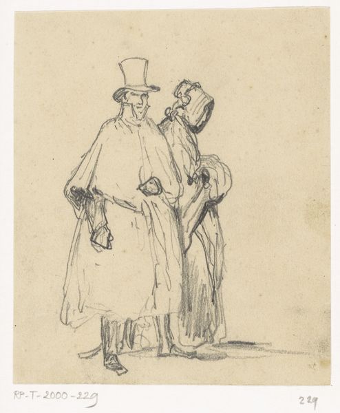 Jan van Essen made this drawing of a group of standing gentlemen with high hats and long coats using graphite on paper. The thin graphite lines create a sense of quickness and spontaneity, as if the artist was trying to capture a fleeting moment. The choice of graphite as a medium is interesting because it is a relatively inexpensive and accessible material, but here, it is used to depict a group of men who are clearly members of the upper class. Their clothing marks them as part of a bourgeois society, a class elevated by industrial capitalism. Consider the relationship between the material and the subject matter: graphite is a material that is associated with labor and industry, yet it is used here to depict men who likely benefited from that labor. Van Essen acknowledges the social context in which the artwork was produced, blurring the lines between fine art and craft, labor and leisure, and materiality and representation.