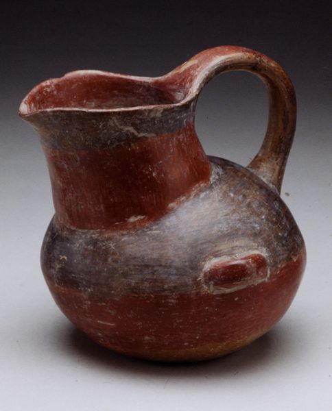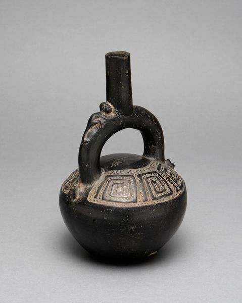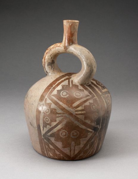 Editor: Here we have an earthenware "Stirrup Spout Vessel with Circular Body and Molded Head and Arms of Animal," made around the year 200 by the Gallinazo culture. Its earth tones give it such an ancient and tactile presence. What catches your eye about this vessel? Curator: The connectivity is what truly captivates. Consider how the negative space created by the stirrup handle interacts with the solid mass of the vessel's body and the stylized animal figure. This interplay establishes a visual rhythm. The horizontal lines encircling the body offer another plane that reinforces this movement. How might you consider the balance of form here? Editor: I think the smooth, round base is nicely balanced by the angular spout and the head of the animal, stopping it from feeling too heavy at the bottom. But what about the coloring? The orange-reddish tint looks deliberate and gives a strange harmony to the composition. Curator: The terracotta palette, heightened through firing techniques, is fundamental to the vessel's expression. It amplifies the formal characteristics, producing both visual unity and subtle modulations in tone, thus revealing texture. Do the variations in surface treatment offer insight into this culture’s capabilities? Editor: You're right; you can really see how carefully they worked with the material. And I see now that it's not just a container, it’s a study in form, texture, and visual balance. Curator: Indeed. Formal elements can provide deep insight into the maker's culture. There is so much in this work for our attention and thought.