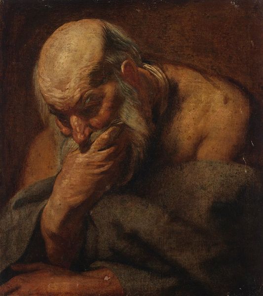 Editor: Here we have "The Philosopher," an oil painting presumably by Luca Giordano. I am immediately drawn to the textures, especially the contrast between the rough fabric of his shirt and the smoothness of his bald head. The lighting seems almost theatrical. What visual elements stand out to you in this piece? Curator: Observe how Giordano utilizes chiaroscuro. The dramatic contrast between light and shadow sculpts the figure, lending him a monumental presence. Consider the composition itself: the diagonal created by the book leads the eye directly to the face, the locus of thought. Note also how the pigment is applied with considerable impasto in the highlights to create strong material contrast against the darker values. Do you agree the surface has a sculptural quality? Editor: Yes, definitely. The impasto makes it feel almost three-dimensional. What about the choice of colors? They seem muted. Curator: Indeed, the earth tones—ochres, browns, and umbers—create a sense of gravity and introspection. However, also observe the subtle use of light reflecting off the skin and the pages of the book. There is considerable skill involved in modulating what, at first, might seem like a rather limited palette to provide a compelling visual texture and form. Editor: It's fascinating how the composition and color palette enhance the feeling of contemplative weightiness. I appreciate seeing how each formal choice supports the artwork's intention. Curator: Precisely. By isolating and analysing these individual components we gain a deeper understanding of the aesthetic system underpinning this piece.