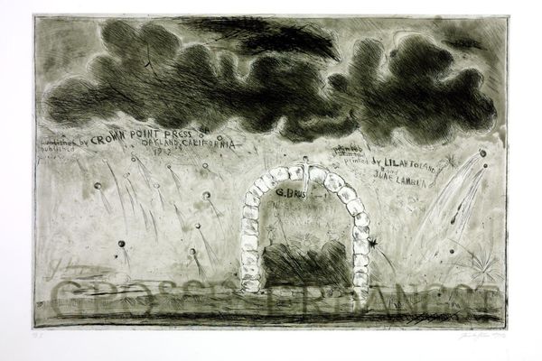 Editor: Oleg Holosiy's "Whales," painted in 1992, using oil paints, presents this very dramatic, almost apocalyptic seascape. What's striking is this monochrome palette, emphasizing the turbulence of the water and the ghostly forms of the whales. What's your interpretation of this work? Curator: Considering the social and political landscape of 1992, particularly in Eastern Europe, this painting speaks volumes about anxiety and transition. The whale imagery, combined with this washed-out, almost decaying color scheme, could be interpreted as representing the colossal, yet vulnerable, forces at play during that time. The institution of the Soviet Union had recently crumbled, and these "whales" could be metaphors for empires, industries, or ideologies in decline, leaving an environmental and social impact in their wake. Does that reading resonate? Editor: It does. The post-Soviet context definitely gives it a sharper edge, hinting at systemic failures. But what about the strange white markings that looks like weeping from the figures? Curator: Ah, a poignant observation. I see them as perhaps reflecting the mourning, the sorrow, for what has been lost, not only materially but also ideologically. In Holosiy's broader body of work, we often find this exploration of collective memory and trauma translated into these kinds of symbolic images. It's a landscape haunted by the past. The choice to show the whales almost capsizing makes me wonder if Holosiy sought to evoke a feeling of nature being as vulnerable as man? Editor: That gives me a lot to think about, especially concerning art as a cultural mirror. Curator: Indeed. It pushes us to consider how art actively participates in shaping our understanding of history. Editor: Thanks! I now appreciate how understanding history helps you read into the social and emotional landscape of that time through the painting.