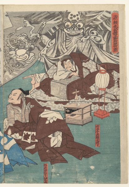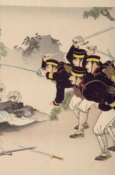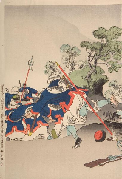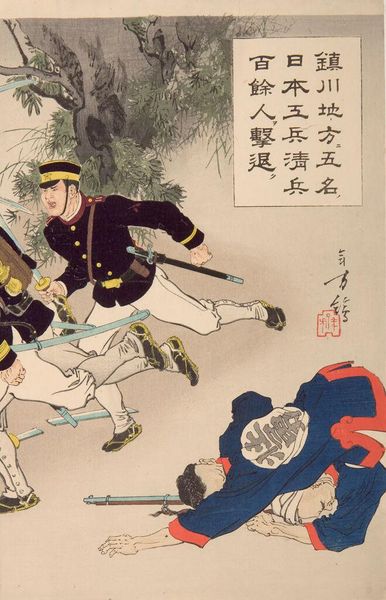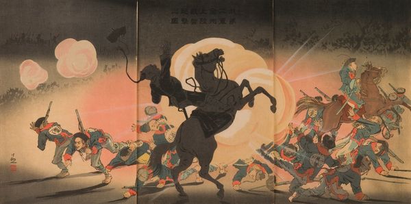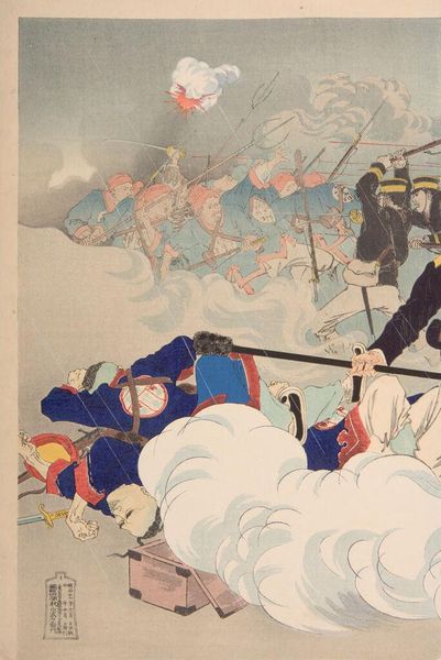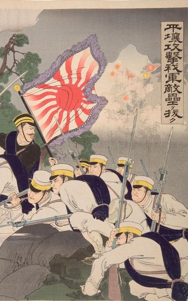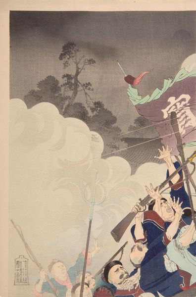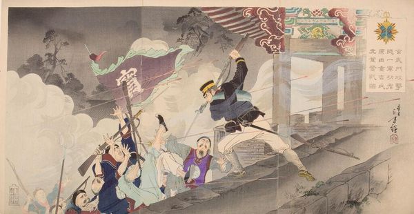 Curator: The energy is palpable! It feels like we're right in the middle of the action. Editor: Indeed. This woodblock print, created by Mizuno Toshikata, captures a scene titled "Harada JÅ«kichi was the First to Climb Up the Genbu Gate and Bravely Attack the Chinese Displaying Military Honor." Curator: The raised rifle, the fallen foe—it’s a clear symbol of dominance. But the gate itself, with its intricate designs, evokes a sense of cultural collision. Editor: The artist is invoking very specific cultural symbols to promote a narrative of military might and national pride. Consider how the image itself was circulated during times of conflict to shape public perception. Curator: And the fallen figure, with his exposed soles, presents a strong symbol of humiliation in some East Asian cultures. Editor: Precisely. The potency of these symbols lies in their ability to communicate complex ideas about power and cultural identity with a single glance. Curator: It's fascinating how a single image can hold so much social and cultural weight. Editor: Ultimately, artworks such as this one invite us to contemplate the narratives they perpetuate and the power they wield.