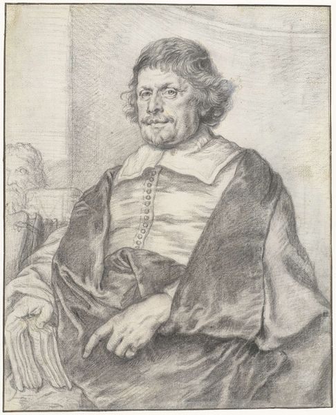 Curator: Here we have Ottavio Leoni’s portrait of Herman van Swanevelt, rendered sometime between 1515 and 1630. The work is an etching, offering a glimpse into the artistic circles of the Baroque era. Editor: My first thought is the level of detail is captivating. The lines are so delicate, especially in the subject's hair, and yet it conveys a real sense of presence. Almost…earthiness. Curator: Indeed, Leoni was known for his ability to capture the likeness and spirit of his sitters. The politics of portraiture in this period were intrinsically linked to the projection of power and status. What’s interesting to me is to what extent Van Swanevelt, a painter himself, shaped the representation, especially concerning ideas about masculine identity and class. Editor: Right, there's a definite effort here to convey not just his physical appearance but his character. But the composition… I wonder about the lack of any background. Is it to focus all attention on the individual, or does it suggest something more about how identity gets constructed – pulled from context? He’s very isolated in this frame. Curator: The absence of background details was common in portrait drawings and etchings of the time, precisely for that focus. The gaze, the costume—every element plays a role in constructing a very particular narrative around male genius and artistry. How are we meant to interpret those buttoned openings, the fine detail in his clothing? What stories are these elements performing about value? Editor: Precisely. His clothing speaks of a certain status, absolutely, but also perhaps a carefully cultivated image, much like how artists strategically position themselves now via their practice. I mean, looking at this now, so much relies on this idea of "great artist". We have to recognize these dynamics were constructed. The artist creates himself as much as is being created. Curator: Ultimately, works like these provide us with entry points for interrogating the cultural values that continue to inform our present. Editor: Agreed. A potent reminder that the way we see has been and continues to be shaped.