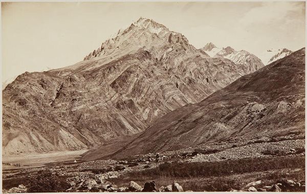 Curator: Samuel Bourne captured this stunning view of the Village of Sonamung, Kashmir. Look at the scale of the mountains in comparison to the village; it’s quite something. Editor: It feels…overwhelming. Like the mountains are guardians, or maybe even looming threats, and the village is just a fleeting moment in their long story. Curator: Mountains often symbolize permanence, wisdom. The way they dwarf the village suggests the enduring power of nature over human endeavors. Bourne was likely drawn to capture that relationship. Editor: I see it, but the tents...they're so small, almost hopeful? The image is about scale, about finding a place in this immense landscape. Curator: Bourne's photographs were incredibly influential in shaping Western perceptions of India. The symbolism is complex, a blend of romanticism and the realities of colonial exploration. Editor: I agree, and as I look at it longer, the stream in the foreground grounds me, making the whole scene feel a little less intimidating. Curator: It's a reminder that even in the face of immensity, life, like that stream, finds a way. Editor: Yes, that little detail changes everything. It's like the image is quietly whispering about resilience.