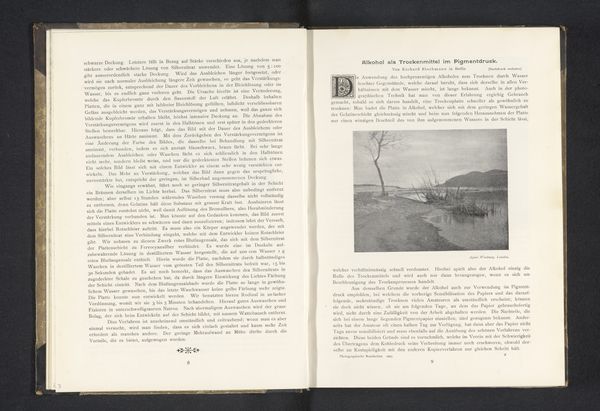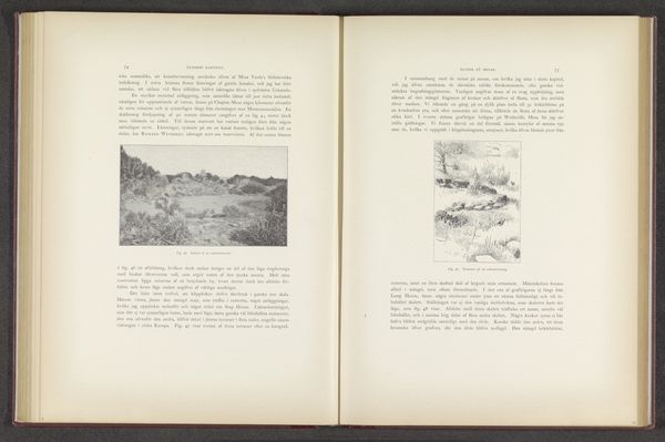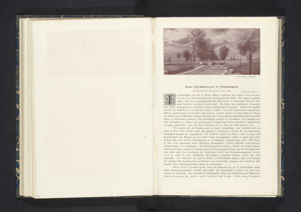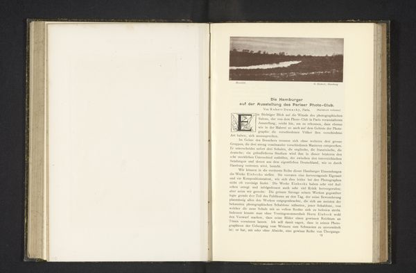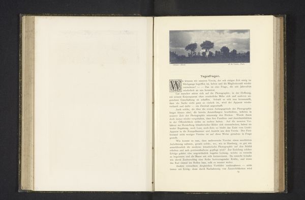Curator: This image, "Duinlandschap," dating from before 1898, is presented as a lithograph within a printed publication. What strikes you about it? Editor: Well, initially, there’s this immediate impression of stillness and muted tones. The composition is interesting with that path winding into what seems to be the core of the landscape, and the bare trees give a distinct sense of isolation. Curator: The photograph used for the lithograph, potentially by P. Ickx, invites us to consider notions of romanticism. Its representation of nature, seemingly untouched, reflects an interesting commentary on the cultural value placed on landscapes at the time. How does this sit within broader colonial narratives and the representation of "virgin" territories ripe for exploitation? Editor: The materiality certainly reinforces this reading. Think about the labor involved in creating both the photograph and then reproducing it as a lithograph. It would have been quite the production involving different artisans. Does the photomechanical process speak to an increasing standardization of artistic creation, somewhat like the assembly line? Curator: Absolutely, we have to unpack who this imagery was targeted towards and what stories it reinforced about the human relationship to land and notions of progress. In this way we have to ask how gender and race shaped access to nature at the turn of the century, both as image producers and audiences, shaping the dominant visual discourse. Editor: It really makes you think about the relationship between the means of production, consumption, and how these depictions played a role in a certain ideology around progress. What was it like to actually visit that place? Were you a person able to own the representation or the place? Curator: By centering class and privilege, what we may interpret as the serene pastoral scene speaks directly to the economic disparity defining Belgium. So I’m struck at how this image prompts broader discussions about place, ownership and the mediation of experience through visual culture. Editor: I think that is such a fitting reflection that reminds us how much an analysis into materiality and production can provide insight into even more personal and philosophical inquiries of identity and lived reality.