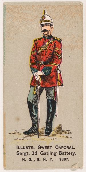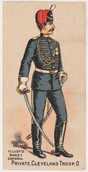 Curator: This image, created in 1888, is titled "Full Dress, Infantry, Italy, 1886," and comes to us from the Kinney Tobacco Company's Military Series. It was part of a larger set of prints designed to promote Sweet Caporal Cigarettes. Editor: Right off the bat, I'm struck by the almost…dreamlike quality. The colors are muted, yet there’s a clear attention to detail in the uniform's design and the soldier’s somewhat melancholy expression. It's like a memory, hazy but vivid. Curator: Precisely. Observe how the artist uses line and color to delineate form. The sharp lines of the rifle juxtapose against the softer shading on the uniform, creating a dynamic tension. Note also the strategic placement of red accents – at the cap, collar, sleeve design and leg line– drawing the eye across the composition and punctuating the otherwise grey-blue field. This elevates it beyond a mere depiction, investing the print with a graphic sophistication, worthy of note. Editor: The soldier's stance too-- almost relaxed. A weird contrast between this beautifully ornate uniform and the mundane duty of holding a rifle. He looks less like a fierce warrior and more like… someone waiting for a bus, albeit in much fancier attire. There’s something subtly unsettling about that dissonance, which kinda stays with you. Curator: Indeed. The work provides an important lens to scrutinize semiotic and visual communication tactics used at the time, specifically advertising that capitalized on notions of patriotism and duty in connecting with their consumers, or audiences. In addition to those formal considerations I outlined before. Editor: It makes you think about the glamorization of war, I mean you look at this card, this image, and almost forget the real dirt and tragedy that actually exist somewhere far away, that have been purposefully extracted in order to push a completely different agenda. . Curator: True. I mean, the artwork, presented within a framework, engages historical awareness by underscoring themes that pertain to history, representation, and visual encoding through drawing, and print. The color story too... So considered... Editor: Yes. The thing is it also triggers a thought that maybe this soldier isn’t who or what he actually is, because somewhere along the line, something in him was purposefully repressed or extracted for consumption in someone else’s reality. Just thinking out loud really. Anyway, its beautiful nonetheless.
