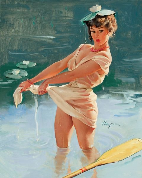 Editor: Gil Elvgren’s 1946 oil painting, "Net Results," depicts a woman on a tennis court, looking slightly flustered. It's...well, it’s definitely eye-catching. What do you make of this image, in terms of its cultural context? Curator: Well, immediately, I see a representation of post-war femininity, carefully constructed, but ultimately, constrained. Elvgren places her on the court, suggesting activity and perhaps even empowerment, but the torn net and her expression hint at a more complicated reality. Editor: Constrained? I see someone playfully caught in a bit of a jam, maybe embarrassed about missing a shot. Curator: Precisely. What is Elvgren saying about the expectations placed on women at the time? This isn't simply a playful image. Consider the gaze: she's caught, almost like she’s caught *out*. This piece, and others like it, shaped the image of women in advertising and popular culture, often reducing them to objects of desire, which in turn perpetuates systems of power. What’s she selling, do you think: tennis or… something else? Editor: I see what you mean. The slightly torn dress, her expression… it all becomes more loaded. Curator: And what about that title, "Net Results?" A pun, yes, but what are the actual “net results” of these kinds of images on women’s autonomy and self-perception? Who benefits from this carefully constructed ideal? Editor: It definitely reframes the work, considering the cultural forces at play and the male gaze so prevalent at the time. I came in thinking lighthearted pin-up, but now I'm seeing a much more critical dialogue on gender roles and societal expectations. Curator: Exactly. By understanding the visual language and historical context, we can unravel the complex messages these images convey and reflect on their enduring impact.