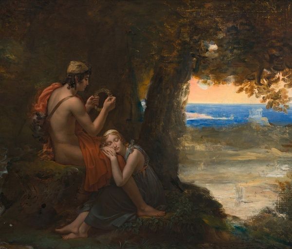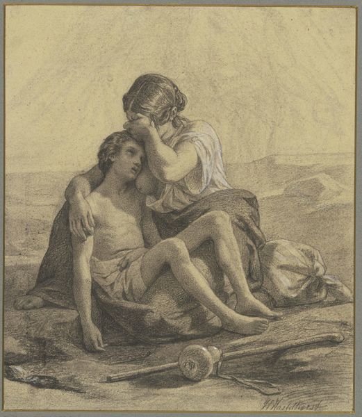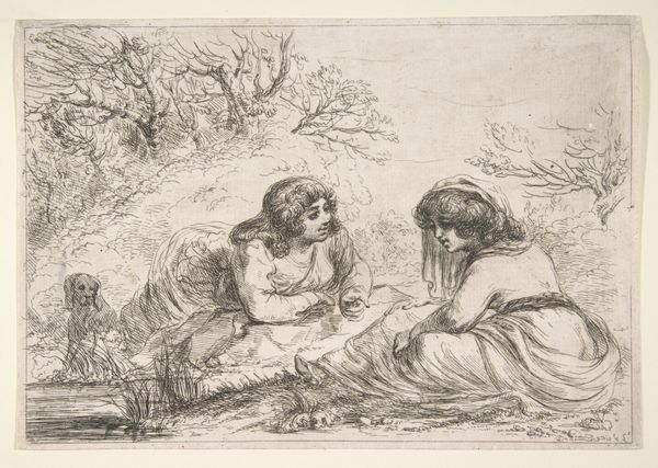 Curator: Before us is "Zwei in der Landschaft lagernde italienische junge Frauen" by Friedrich Karl Hausmann, currently residing here at the Städel Museum. Though undated, it's a striking example of the Romantic era's fascination with Italy. What are your initial thoughts? Editor: There’s a distinct feeling of reverie. The women, rendered in soft charcoal, are lounging with such graceful ease. The landscape feels almost like a dreamscape, muted and hazy. Curator: It certainly evokes a particular mood. The image comes at a time when travel, especially to Italy, became central to notions of education and refinement among the European middle class. These women, Italian subjects, represent an idealized version of that experience. Editor: I see echoes of Arcadia here. The woman with the lute acts as a sort of muse. Playing an instrument traditionally connected to pastoral themes and the romantic ideal of leisure and contemplation. Do you see hints of mythology in this repose? Curator: Interesting point. I'm inclined to see their instrumentation as representing a changing social order. Art began to be viewed as less strictly an aristocratic preserve and more about cultural edification for the burgeoning middle class. Perhaps it is invoking both! Editor: True! Lutes aside, note the headdress, likely associated with ideas of folk traditions or even tropes of exoticism that romanticize the common life and that landscape! Curator: You raise an essential point about visual tropes and cultural reception! The setting plays a huge role. Italian landscape wasn't merely geography; it represented history, artistic inspiration, and even liberty to certain European elites during the late 18th and early 19th centuries. Editor: The way these figures meld into that very setting becomes intriguing, though! Their clothes, their instrument even. I'm interested in that seamless continuity, or rather, in what feels specifically, artfully placed about that harmony. Curator: Precisely! These objects have not only cultural weight, they give Hausmann a way to visualize some of the major transformations shaping art's function, role, and audience in European society. A testament to art and life intersecting as a powerful source of symbolism. Editor: It's all there in this drawing - Hausmann encapsulates the essence of longing for an idealized and somewhat fabricated pastoral simplicity! I leave seeing this in an entirely new light! Curator: I agree. This really enriches our understanding of how art helps people respond to rapid shifts in how we think about history and community.