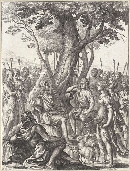 Editor: This is Hendrick Goltzius's 1586 engraving, "Announcement of the Birth of Samson." It's currently held at the Rijksmuseum. I find the stark contrast of light and shadow so compelling. How do you interpret this work within its historical context? Curator: Goltzius masterfully uses the engraving medium here, doesn't he? The announcement narrative – it isn’t merely a scene of divine intervention but rather a commentary on power, faith, and gender roles within 16th-century society. Note how the angel almost dominates the space. What does the woman's bowed head signify to you? Editor: Submission? Maybe humility before the divine? Curator: Perhaps. But think about the societal constraints placed on women during this period. Her stance reflects the limited agency afforded to women, even in the face of miraculous events. Samson's birth, of course, will be pivotal – a male figure destined for power – but her role as his mother is subtly minimized within this composition. Doesn't it make you question the narrative around heroism and the erasure of female contributions? Editor: So you're suggesting Goltzius's work, while seemingly a straightforward biblical illustration, is prompting us to consider gendered power dynamics? Curator: Precisely. And consider how religious narratives were frequently used to legitimize existing social hierarchies. Goltzius isn't necessarily endorsing these structures, but he's undeniably participating in a visual language deeply embedded in contemporary ideological struggles. What strikes you most now, seeing it through this lens? Editor: The seeming passivity of Samson’s mother really stands out. I initially missed how much the composition emphasized the angel and her husband. Thanks to your perspective, I recognize its deeper social implications. Curator: Absolutely. Art gives us such possibilities to reflect.