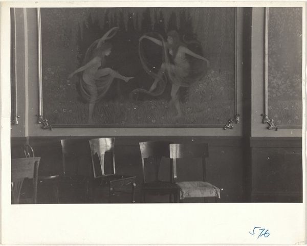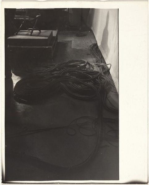Curator: Here we have Robert Frank's gelatin silver print, "Hotel Lobby--Los Angeles," taken in 1956. It's so evocative. Editor: Immediately, it feels like I'm peering into a forgotten corner, shrouded in mystery. There's something almost melancholic about the composition, a weightiness in the shadows. Curator: Exactly. Frank captured such raw honesty, almost brutal at times. This particular photograph, though, has a quiet desperation about it. There are actually two figures. Editor: I see them. One is seated, almost swallowed by the dark; the other one is up in a booth in a different plane altogether. Is it even the same room? There's a screen or a divider. What do the two figures symbolize here in social realism terms? Curator: That's one reading for sure. Frank was dissecting the American social landscape at the time. But beyond race, you have that sort of anonymous figure in the back behind a wall--an everyman. To me, it seems like they are representing completely separate strata of society. Editor: In iconographic terms, you have the classic theme of separation here, right? Dark versus light, front versus back. But that woman and that clear plastic bag sitting on what looks like a bench gives me pause to think. Perhaps she just arrived and is waiting, perhaps she is resting between tasks, or maybe is even down on her luck. But this humble lobby is a poignant microcosm of society. Curator: It is incredibly potent. It shows you a real world experience and not sugar coating or pretending anything that isn't there. The high contrast, that gritty feel…it all reinforces the feeling that this photograph is revealing something about the American condition that polite society usually chooses to ignore. Editor: Even in the so called glamour of Los Angeles? Frank presents us with images and iconography not as frozen history, but a living, breathing continuity that invites our introspection. The composition, the contrasts, the shadows...it creates an intimate space for contemplating larger realities. It does linger, doesn't it? Curator: It certainly does. The questions it raises still resonate deeply today. It makes you think beyond the superficial layers.