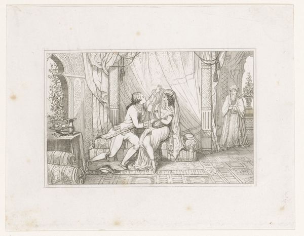 Curator: Here we have "Before," an engraving by William Hogarth, created in 1736. It is part of a pair of works depicting a scene of courtship, residing here at the Minneapolis Institute of Art. What strikes you initially? Editor: Well, right off the bat, there’s a real tension in this scene, almost claustrophobic, with the heavy drapes and cluttered space. It's as if the air itself is charged with expectation… and maybe a little dread! Curator: Precisely! Hogarth’s masterful use of line creates a visual drama, almost a snapshot from a play. Notice the arrangement of figures and objects – how they lead the eye. The gaze is directed towards the couple but notice the dog to the side? Editor: Ah, yes! The dog almost acts as a moral observer, detached but keenly aware. Is he sniffing out a rat? Curator: Indeed. Details like the cherub painting above and scattered articles, also offer clues about Hogarth’s critique of manners and morals, using the framework of genre painting. What of the narrative impact, beyond technique? Editor: It feels like Hogarth is playing puppet master, pulling strings of satire with a wink and a smirk! The expressions are theatrical, exaggerated. We feel the anticipation and awkwardness. Curator: The artwork reflects his use of humor as a method for societal comment and his influence of narrative on art in England, an important perspective that departs from other artists. Hogarth also understood how best to convey complex stories using engravings and this work is definitely not an exception. Editor: Right! And that’s what's so interesting, this print makes us ask 'What's the real story? What happened right after?' Curator: Exactly! Hogarth leaves much to our imaginations. His skill lies not only in representation, but his ability to invoke questions. Editor: You know, it makes you wonder what other scandalous narratives hide behind tapestries, doesn’t it? A true glimpse of the naughty past, if I may say so.