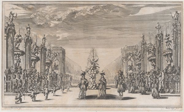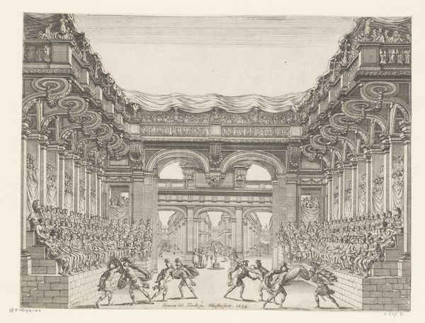 Mathäus Küsel made this print of a stage design called 'The Roman curia with guards in the anteroom; set design from 'Il Fuoco Eterno' using engraving. Here, Küsel represents an interior, likely for a performance in a courtly context in the Holy Roman Empire. We see the spatial politics of the court on display: guards flank the foreground while courtiers are seated in the distance. This print gives us access to the way space was organized and understood within the institution of the court. This is useful for understanding the politics of imagery. This design is rendered with close attention to detail and ornament. What can this tell us about the values of the court? The print demonstrates that art is contingent on social and institutional context. Historians consult prints and other documentary sources to better understand the cultural and political forces at play in the history of art and performance.