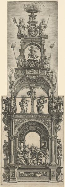 Editor: This is "Speculum Romanae Magnificentiae: The Base of the Column of Theodosius," an engraving by Marcantonio Raimondi, dating sometime between 1530 and 1580. It's incredibly detailed, almost archaeological in its precision. What strikes me is the overt display of power and how deliberately it’s being presented. How do you see this piece operating within its historical context? Curator: Well, the “Speculum Romanae Magnificentiae,” or "Mirror of Roman Magnificence," was conceived as a means to evoke the grandeur of Rome, especially for those who couldn’t travel there. This print is less about pure archeology and more about the political implications of visually preserving and disseminating Rome’s historical power structures. Consider the choice of Theodosius' column: a symbol of imperial authority and triumph. Editor: So it's about power as much as preservation? I guess I assumed the aim was accuracy first, glorification second. Curator: I'd argue the glory *is* the point. Raimondi isn’t simply documenting; he’s actively constructing an image of Rome intended to legitimize contemporary power by associating it with a powerful past. Look at the figures – the winged victories, the putti, the inscription S.P.Q.R. These are potent symbols being re-deployed. How do you think this kind of imagery resonated with its viewers? Editor: It’s interesting to think about how readily viewers might have bought into that message. Perhaps, encountering such impressive visuals, they didn't question the authority being projected, then or now. It definitely changes my perspective knowing that the print is performing its own power play! Curator: Precisely. These prints functioned as tools in a larger game of political and cultural influence, revealing the enduring legacy, and arguably, manipulation, of Roman symbols. Editor: This was more than just an artistic study; it was political. Understanding that shifts the entire framework for analyzing it. Thanks for illuminating that aspect for me!