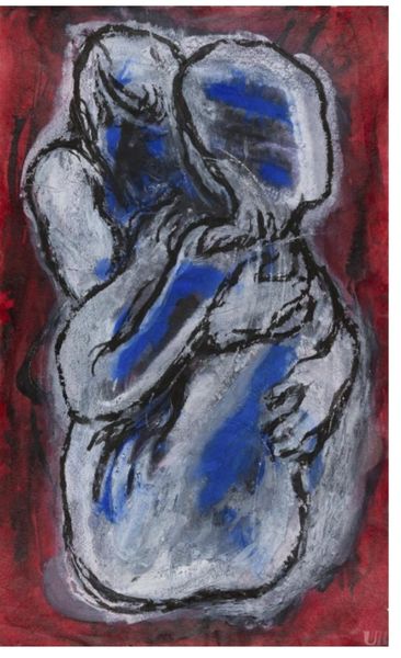 Volodymyr Loboda painted "Matrena and Elizaveta" with what looks like acrylic on canvas, and right away, the striking blue grabs your attention, doesn't it? Loboda's use of color is pretty bold here. It’s not just about representing reality; it's about feeling. See how the green outlines the figures, almost like a protective aura? Then, there are these little pops of red, like tiny heartbeats scattered across the canvas. It's like he’s saying, "Here’s the structure, but here's also the life, the pulse." I think of artists like Milton Avery who use color in similarly expressive ways. Ultimately, Loboda’s painting feels like a reminder that art isn’t just about what you see; it’s about what you feel, what you bring to it, and what it stirs up inside you.