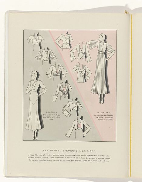 Curator: Here we have "Femina, Mars 1928: 9: Modeshow met twee modellen van Jeanne Lanvin," created in 1928. The artwork, rendered in ink and drawing on paper, presents an iconic image of Art Deco elegance. Editor: Immediately, I’m struck by the strong lines and muted palette, so subtle. The composition seems so studied, it is like the geometry echoes in their clothes. Curator: Precisely. This piece showcases how fashion magazines of the era were actively constructing and disseminating new ideals of womanhood. Jeanne Lanvin was an influential designer, and this illustration provided aspirational imagery for a growing consumer culture. The art deco aesthetic mirrored social change with its modern geometry reflecting a world embracing progress and modernity. Editor: Look how the background is simplified – the receding planes draw your eye right to the models. The lack of strong colour makes the clothing itself the subject, allowing the details to do all the talking. Curator: Absolutely, and that simplified background points to an interesting feature: notice how the piece emphasizes a sense of urbanity and sophistication, subtly placing the models within the socio-economic landscape of the roaring twenties. These publications weren't simply documenting trends; they actively helped construct the fashion industry's power and exclusivity. Editor: And that long flowing dress on the left—the linear folds and the layering create such rhythm. It gives the impression of continuous movement, though it’s all captured so rigidly on paper. The layering and controlled cascading style of that gown show off its fabric to such striking effect, especially in contrast with the cleaner lines of the outfit on the right. Curator: Indeed, the drawing reveals not only the styles of the day, but also hints at the aspirations and realities of women within the socio-political framework of the time, highlighting fashion's role as both a reflection and a driver of social transformation. It prompts you to reflect on these constructed narratives of beauty and elegance during a pivotal moment in history. Editor: It all builds up to an experience – to be modern, in both a structural, aesthetic sense and how we perceive our role as individuals and within society. That focus is, perhaps, the true enduring subject.