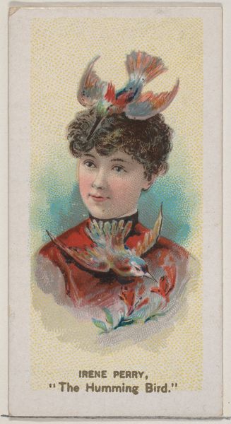 Curator: Well, hello there. Isn't this delicate? It's "Miss Maud Branscombe," a piece from the "World's Beauties" series, dating back to 1888. It was created for Allen & Ginter Cigarettes. Editor: She looks so poised, so proper, like a porcelain doll, almost impossibly perfect with those blushed cheeks. Is she real, I wonder, or a beautiful fiction? There’s something haunting about the serene profile. Curator: Ah, but consider the context, a cigarette card! Part of a series used as promotional inserts, imagine finding this among your tobacco. These weren’t meant to be high art but mass-produced images of ideal womanhood. Think of it as proto-Instagram, the curated images that permeated Victorian culture, subtly promoting specific ideals about beauty and woman's place. Editor: Right, so a cigarette peddler's fantasy. Even so, that dreamy aesthetic feels potent! It’s very "Art Nouveau," softened by a dash of impressionistic rendering. Look how the colour kind of glows around her. It elevates the whole thing beyond just product promotion into the territory of a charming dreamscape. Curator: Absolutely, and these cards played an interesting role, not just in marketing but in collecting. Sets like "World's Beauties" became very popular; people collected and traded them. They tell us so much about the societal gaze, the kind of face that sold things, literally! A pretty strange precursor to the influencer, when you think about it. Editor: Precisely, a different age of "beauty." What do you think, knowing how the artwork functions gives this artifact deeper resonance than just surface charm? Curator: Certainly, context shapes our appreciation, doesn't it? Understanding its purpose adds layers of meaning; a pretty picture becomes a mirror reflecting social values. Editor: Absolutely, the lovely 'Miss Maud' becomes even lovelier. It is nice thinking that a commercial art still manages to be striking, despite all.