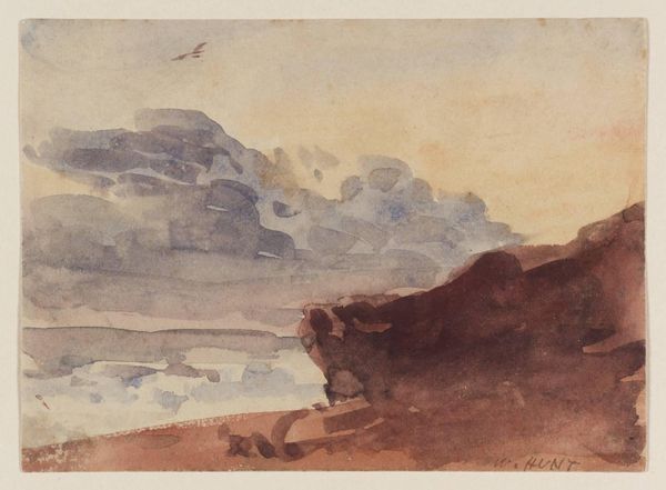 Curator: This is William Blake's "Landscape near Felpham," part of the Tate collection. The piece shows a coastal view rendered in delicate watercolor. Editor: It feels unfinished, spectral almost. The washes of blue and grey create a moody atmosphere, but the barely-there depiction of what could be buildings or a boat adds to the ethereal quality. Curator: Blake lived in Felpham for a time, and this landscape might reflect his complex relationship with nature and the sublime. Felpham represented a period of intense artistic exploration and spiritual questioning for him, impacting his later work. Editor: I wonder how much his personal experiences shaped his perspective. Was this coastal scene a sanctuary or a source of existential contemplation during that time? The lack of vibrant colors almost conveys a muted sense of hope or perhaps resignation. Curator: Exactly. Felpham was a rural area in the early 1800s, but we must understand its historical context in relation to the Napoleonic Wars. Blake's radical views clashed with the political climate, and he was even tried for sedition. Editor: That context is crucial. It reframes the image; this isn't just a landscape, it's a product of a specific time and socio-political struggle. It encourages us to consider individual identity and social commentary. Curator: Absolutely. It makes one wonder how Blake viewed notions of selfhood and his place within that tumultuous period. Editor: A landscape pregnant with meaning, then.
