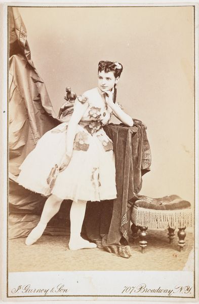 Curator: What a delightfully ambiguous photograph. We're looking at "Perrone en Ernst v/d Minne" by Willem Witsen. This piece, held at the Rijksmuseum, dates from somewhere between 1860 and 1915. It's photography presented in a romantic style. What leaps out at you? Editor: The first thing that strikes me is the dreamlike quality—or maybe slightly nightmarish. It’s faded, almost spectral. Like a memory, but one that's trying too hard to be "period appropriate." The lighting has that theatrical, posed feeling. It has this ghostly atmosphere I can’t shake. Curator: You’ve zeroed in on something quite interesting. The title, literally translated as “Peronne and Ernst of Love," hints at a genre painting, perhaps a depiction of courtly love or a staged romantic tableau. Notice the costume-like attire. Witsen seems preoccupied with visual historical codes and the performative aspect of the setting, especially concerning themes of romantic or sentimental love. Editor: Exactly. Those clothes feel like…symbols. The woman, serenading with her instrument, maybe it’s supposed to signify devotion or the "sweetness" of courtship. The man—stiff as a board! I feel that stiffness embodies some notion about honor. There is also a subtle contrast: he is rigid; she is flowing. Perhaps even passion versus social expectations? Curator: Good eye! The attire has this kind of allegorical implication that speaks to cultural memory. It uses symbolism. And speaking of expectations, the fact that they are posed on some platform with trailing skirts looks staged. This isn't snapshot realism; it’s an invented, deliberately artificial moment. Editor: Which kind of backfires. It’s supposed to represent the tenderness of courtship, maybe the beauty of musical expression…but something’s off, creating a feeling of disconnection rather than a believable romance. Maybe he should crack a smile or something! Curator: The disconnection may point to how Witsen uses photography less to replicate the ‘real’ and more to question representation itself. The photograph creates something akin to looking into the distant past. Perhaps there are subtle ways the artist questions themes associated with Romanticism through this image? Editor: Perhaps, that artificiality is an active component. Anyway, my sense of uneasiness hasn’t diminished one bit, which might be something in its favour! Curator: An aptly articulated ending point; it seems we may need further ruminations on our initial impressions here in the galleries later!