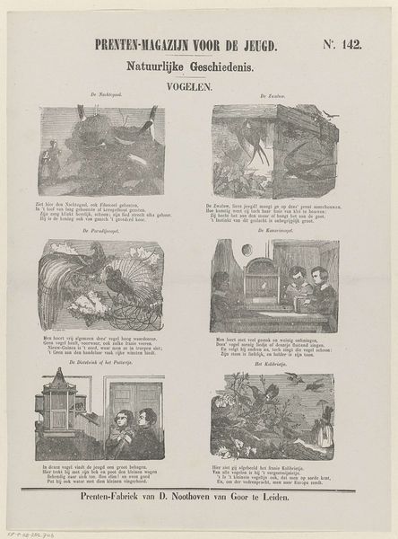 Editor: Here we have “Vogelen,” or "Birds", an engraving by Dirk Noothoven van Goor, likely from the late 19th century. It's a rather busy composition, with six vignettes on a single sheet. What do you see when you look at this print? Curator: Formally, the work is quite fascinating. Observe the strong linear quality achieved through engraving, which creates stark contrasts between light and shadow. Each vignette, though small, operates as a self-contained study in composition, relying on basic shapes to communicate depth and form. How do you interpret the use of line in conveying the textures – feathers, water, foliage? Editor: The line work is interesting now that you mention it. In some areas, like the flamingo's feathers, it’s quite delicate. In others, such as the shadows of the geese, it's much bolder. Curator: Precisely. This manipulation of line weight and density is a key element in understanding the artist's intent. Note also how the negative space around each bird contributes to its individual presence, defining its contour. Editor: So, you're suggesting the artist isn't just depicting birds, but also thinking about how lines and shapes create form? Curator: Exactly. It's less about representational accuracy and more about exploring the fundamental principles of visual construction through simple binaries. Each vignette is an opportunity to unpack his deliberate decisions. Editor: I never considered analyzing the space *around* the subject. Thanks for pointing out that the relationship of the lines to the negative space is as important as the line itself. Curator: Absolutely. Visual art often thrives in these in-between spaces of relationships, binaries, and implied presences. The arrangement and interpretation create dynamic interest even when representational qualities are less important than form itself.