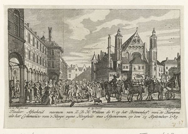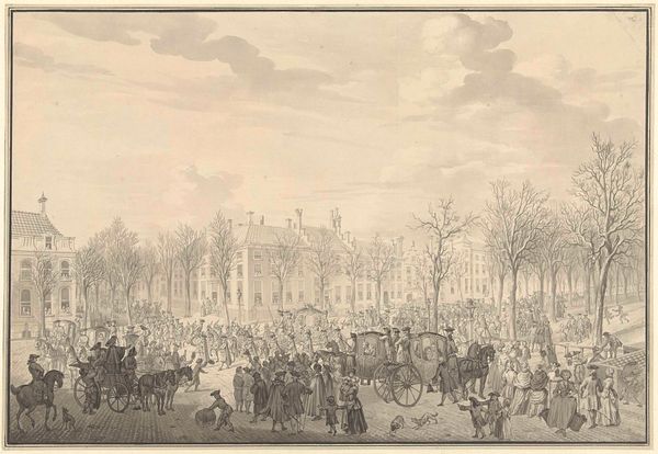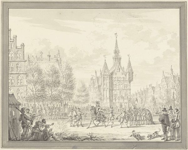 Carel Christiaan Antony Last created this print called *Maskerade door studenten in de Breestraat* in 1855. It captures a street scene in Leiden during a student masquerade, reflecting the social and cultural life of the Netherlands at the time. These parades, often elaborate, served as a stage for students to express their identities and critique or celebrate societal norms. The presence of Dutch flags and the attire of the participants suggest a complex interplay between national identity and academic freedom. The students, as members of an educated elite, occupied a privileged position and their participation in such events reflects their status and influence. The work offers a glimpse into the way in which students used public spectacle to negotiate their place in society. It evokes a sense of nostalgia for a time when student life was closely intertwined with civic events and broader cultural expressions.