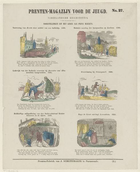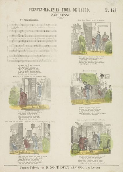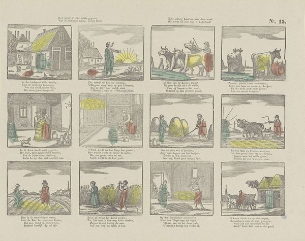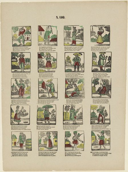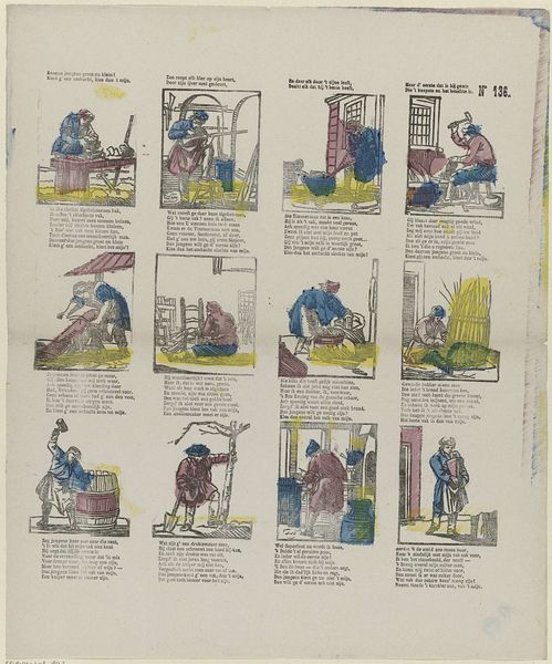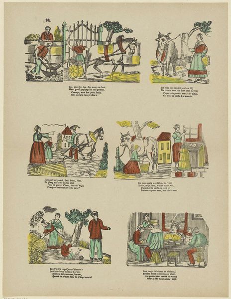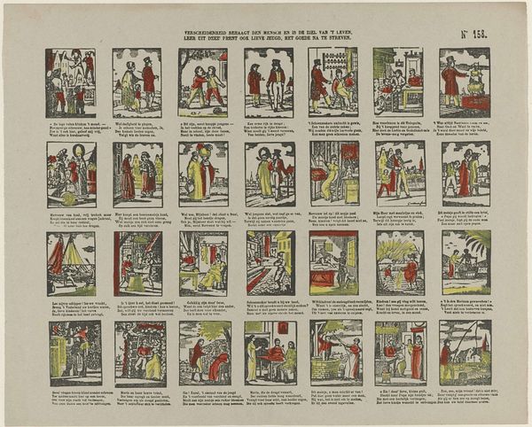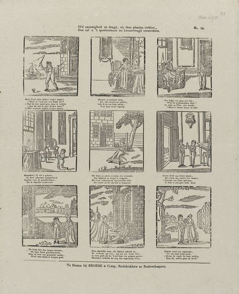 This print, titled 'Deugden', or 'Virtues,' was made by Erve Wijsmuller. While the exact date is unknown, the relatively simple printmaking process gives us a clue about its social context. The image consists of eight scenes, each representing a virtue such as friendship, love, or hope. It was printed onto paper using a technique called woodcut, where an image is carved into a block of wood, inked, and then pressed onto the surface. The woodcut technique allowed for mass production and distribution, making the print accessible to a wide audience. The relatively coarse lines and simple compositions suggest that this was not intended as a high art object, but rather as an affordable and educational tool for moral instruction. The virtues depicted in the print reflect the values and beliefs of the time, emphasizing the importance of personal qualities, social relationships, and religious faith. Considering the modest materials and production processes, we can appreciate how these were instrumental to its cultural purpose, blurring the lines between art, craft, and popular culture.