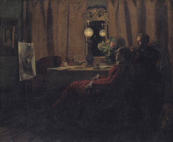 Editor: This is "Comedian Constant Coquelin Aka Coquelin Aîné in his study," an oil painting. I find the space quite crowded but very intimate. What are your initial thoughts? Curator: There's an undeniable density of imagery, isn’t there? The portraits, the papers, the very air feels thick with meaning. But consider what’s prioritized: Coquelin is captured *in media res,* writing. It makes me wonder, what is the significance of capturing a famous comedian not in performance, but in the act of creation? What image of himself is he trying to shape? Editor: So it's a construction of an image, and not just a portrayal of a person? Curator: Precisely. Note how his study itself is filled with images – paintings on the wall, sculptures on the mantelpiece, each one echoing aspects of identity and profession. Are these the masks of his trade, carefully curated? The paintings are symbols that serve his public self. It begs the question: does a comedian ever truly stop performing? What narratives are woven into these details? Editor: I hadn't thought about it as a carefully constructed representation. Now I’m looking at the items in the room like they’re all stage props, somehow. Curator: In a way, they are. Friant painted the person, but also an persona that has many layers to it, so that we still analyze today. These details are clues. The comedian’s workspace reflects and reinforces his constructed self. We learn about cultural memory through these images. How does the room shape the sitter, and the sitter the room? Editor: It’s like looking at a collection of symbolic echoes! It feels richer, more complex now. Thank you! Curator: A pleasure! There is far more than initially meets the eye.