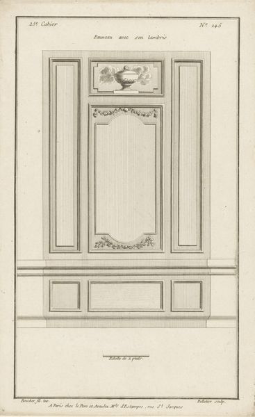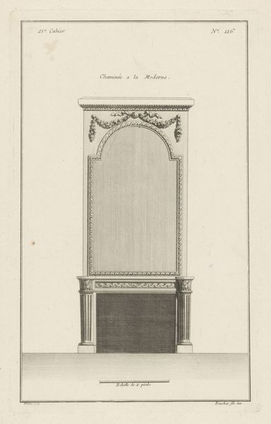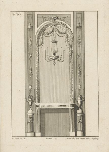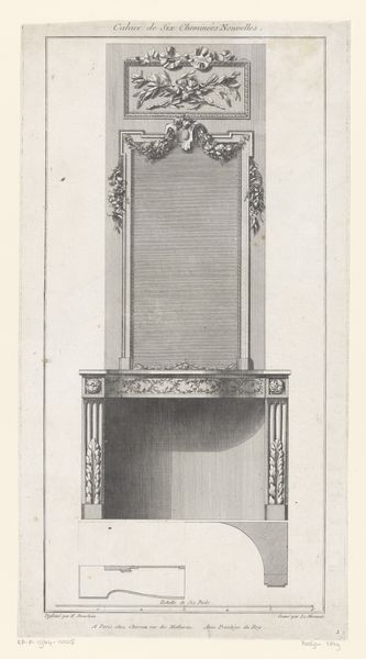 Editor: So, here we have "Schouw met lier," which translates to "Mantelpiece with Lyre," a drawing by Jean Pelletier, made sometime between 1772 and 1779. It's currently housed at the Rijksmuseum. It seems so precisely rendered... What stands out to you in this image? Curator: The rendering highlights the materiality of elite domestic life. Consider the labor invested in producing such an object – from the quarrying of the stone to the skilled artisans carving the ornamentation. These chimney pieces were potent status symbols. Who benefited from this material excess, and who labored to produce it? Editor: That's a good point! I hadn't really thought about who was involved in making it beyond the artist. How does that fit with Neoclassicism? Curator: Neoclassicism here functions as a marker of refinement and taste for the patron, while simultaneously masking the complex system of production required to bring it into being. The clean lines and classical motifs present an image of order and reason. Do you think this aesthetic promotes or conceals certain socio-economic realities? Editor: I guess it conceals it to some degree. The engraving presents a sanitized version of reality, almost erasing the human element involved in its production. Curator: Exactly. It speaks volumes about consumption and status through material goods during this period. The paper, the ink, the artisanal skill needed for the engraving... it's a layering of material signifiers of class and cultural capital. What have you noticed through this exchange? Editor: I'm now thinking about the object's entire life cycle, from raw materials to a finished product that signifies wealth and status. It’s fascinating to consider the unseen hands that contributed to its creation. Curator: Indeed, by focusing on the materiality and means of production, we begin to unravel the complex social relations embedded within even the most seemingly simple image.