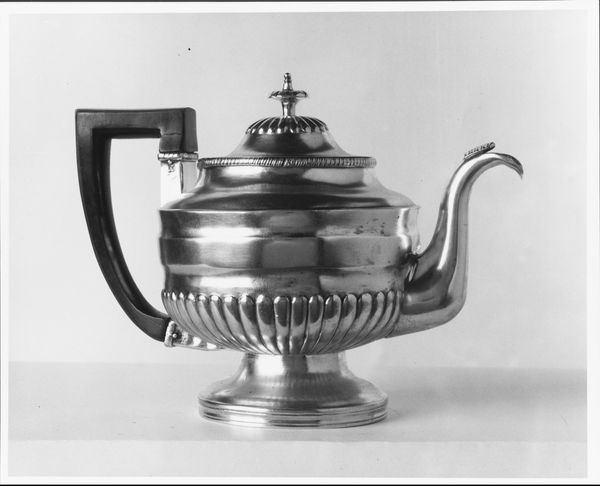 Curator: Let’s consider this silver teapot crafted by Alfred Welles between 1807 and 1810. It's currently housed in the Metropolitan Museum of Art. Editor: The severe geometry and elegant sheen give the work such an air of reserved dignity. What do you see in this piece? Curator: I see a powerful commentary on class and social ritual. Consider the cultural weight of tea during the early 19th century. It was a luxury item, steeped—pun intended—in the politics of trade, colonialism, and labor exploitation. This teapot isn't merely a functional object. Editor: How so? Curator: Its very existence signifies wealth and participation in a complex global system, often built on the backs of marginalized communities. Think about the origins of the silver itself, and the wood for the handle. What does the crafting and display of such an object say about its owner's position in society, and perhaps even their complicity in unjust systems? How does its gleaming surface both attract the eye and perhaps obscure its problematic origins? Editor: That really shifts my perspective. I was focused on its simple, striking appearance. Curator: The seeming simplicity is deceptive. Consider who had access to tea, to silver, to leisure. Reflect on who did not. The object becomes an emblem of disparity. What conversations do you imagine happening around this teapot? Editor: Probably conversations that upheld the very systems you are critiquing! I hadn't considered the global supply chain inherent even in something as small as a teapot. Curator: Exactly! It invites us to interrogate the silent narratives embedded within everyday objects. Editor: I’ll never look at a teapot the same way again. Thanks for that critical perspective!