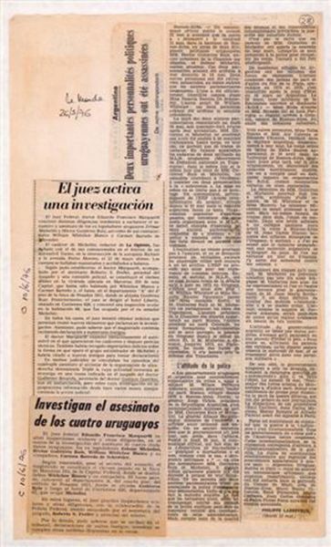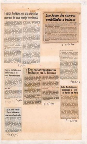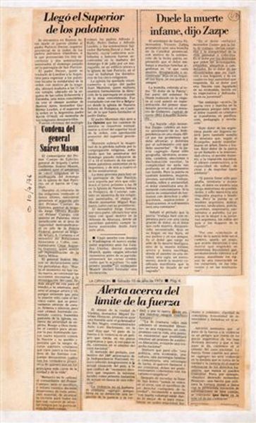 Curator: This untitled work from León Ferrari presents us with something stark: newspaper clippings, seemingly raw and unfiltered. It’s approximately 420 by 297 millimeters, so about the size of a standard piece of paper. Editor: My immediate feeling? It’s a punch to the gut. The cold, hard newsprint…it feels like being confronted with undeniable horror. Curator: Indeed. Ferrari often used collage to confront political and religious hypocrisy. Here, the headlines scream of violence against clergy in Argentina during a dark period of political turmoil. Editor: And it's the lack of embellishment that gets to me. The directness. The way the text is presented, unaltered, pulls you into that moment of reading the news, absorbing the shock. It's brutal. Curator: The rawness is deliberate. Ferrari avoids commentary, letting the juxtaposition of the reports speak for themselves, highlighting the complicity of institutions in the face of such atrocities. Editor: It’s a powerful reminder that art can be a mirror reflecting the uncomfortable truths we often try to ignore. Ferrari's work demands we look and remember.