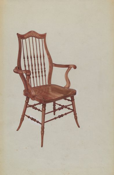 Curator: So, what leaps out at you about this work, Editor? It's a watercolor and pencil drawing on paper by Bernard Gussow, dating from around 1936. He titled it "Side Chair." Editor: Immediately, a sense of calm, Curator. It's so meticulously rendered, it's almost reverential. I feel like it could sit comfortably in a Vermeer interior. There’s a beautiful precision to it. Curator: Precision is an apt term. Gussow’s use of line to define form is exceptionally clear, almost architectural in its exactitude. Consider how the watercolor is employed. See how the artist evokes volume, lending subtle tonal variations to the wooden frame of the chair. Editor: And how the woven seat contrasts texturally with the hard wood. The linear quality, though, feels almost dreamlike. Maybe it's the soft, muted tones, but it gives off a hushed, nostalgic vibe, as if conjured from memory. I imagine myself perched on it on a stifling hot day on the veranda. Curator: Interesting. This "dreamlike" quality you're referring to arises, perhaps, from the stylized rendering of a mundane object, elevating it, via formalism, to something beyond mere representation. Its compositional structure adheres to certain conventional guidelines, yet it maintains a subjective, abstracted representation. Editor: I agree about its abstract qualities. Even though it’s clearly representational, there is something almost spiritual. The symmetry, the balanced lines – it borders on the iconic, doesn’t it? A timeless design reduced to its beautiful essence. Curator: Indeed, this drawing achieves that equilibrium precisely through Gussow's masterful handling of formal elements—his strategic distribution of line, color, and texture all contribute to this artwork's resonance. Editor: For me, its evocative simplicity, coupled with those confident, decisive lines, makes this drawing a treasure. There is much conveyed with only a few strokes, and the mood created really takes the drawing out of pure function to someplace rather ethereal. Curator: I concur that it stands as a testament to Gussow's abilities.