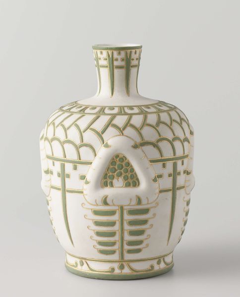 Curator: This exquisite piece is titled "Vase with Incised Design and Salamander Handles in Kochi Style," crafted by Eiraku Hozen sometime between 1800 and 1849. It currently resides here at the Metropolitan Museum of Art. Editor: My first impression? The boldness of the yellow glaze. It's arresting and immediately draws the eye, a potent choice. It feels joyous almost, while the geometry suggests imposed control. Curator: Indeed, the yellow is striking. Observe the incised geometric patterns that bisect the curvature of the vase itself. It adds structure and a visual layering to the earthenware form. Semiotically, this juxtaposition presents something of a binary. Editor: Agreed, this could point to social meanings relevant to the period. Was this intended for a privileged, perhaps even imperial, audience? Yellow, historically, carried complex significance in hierarchical social structures in Japan. Curator: The material bears significance as well. Consider the handles; rendered as salamanders, their deep russet contrasts profoundly with the primary field of the vase. This subtle counterpoint is far from accidental. Editor: These decorative elements move me to contemplate broader interpretations of identity and symbolism at the time. Does the amphibian motif suggest cultural metaphors of adaptability and transformation? Curator: It could, but one should remain careful when reading in overt allegories. Though symbolism and cultural context inevitably intersect, we risk reading anachronistically, instead the incised pattern yields, fundamentally, an investigation into visual harmony. Editor: But isn't this pursuit of “harmony” also culturally embedded? The aesthetic choices reveal an individual’s, and indeed a society’s, negotiation of self. By acknowledging the vase as more than just the visual form we expose deeper truths about power and representation in Edo period Japan. Curator: An interesting perspective. Thank you for illuminating, if not altering, my interpretation of Eiraku Hozen's artistry. Editor: And thank you. It's a fruitful reminder that formalism, too, is always itself shaped by social narratives, explicit or otherwise.