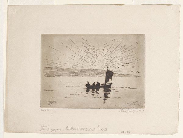 Curator: Here we have Philip Little’s “Hauling the Seine,” an etching from 1921, currently residing here at the Minneapolis Institute of Art. Editor: My first thought is how somber and subdued this scene appears. The tonality really lends a certain gravity to the physical exertion of fishing. Curator: It's evocative of a working-class portrayal during the early 20th century, an era deeply influenced by labor movements and agrarian reforms. Consider how artists like Millet romanticized peasant labor; Little appears to do something similar. What do you make of the technique? Editor: Well, you can clearly see the etching process at work in those delicate yet distinct lines, it really suits the portrayal of manual labor. The rough strokes feel deliberate, mirroring the arduous nature of pulling those heavy nets. Curator: The print medium allowed for wider distribution, thus influencing public opinion about labor rights. It makes one wonder how effective this form of art was in highlighting the everyday struggles and stories, doesn't it? Editor: Definitely. But let’s think also about access—the raw materials like the paper and inks, who controlled them? Even something seemingly simple carries layers of economic meaning tied to consumption and access. This artwork, both the fishing operation it shows and its own existence, depends on intricate systems of production and labor. Curator: Absolutely. There's something profound in the ordinariness represented here, elevating it beyond just a landscape or a genre piece. It allows a critical gaze at how labor has shaped and supported cultural landscapes across multiple eras. Editor: And it pushes us to think: Who are these workers? Are they properly compensated? Are their tools durable, and made ethically? Are they fishing sustainably? Art that speaks to process can generate many pertinent social questions. Curator: I’m leaving with a richer appreciation of Little’s work and also your interpretation, emphasizing materiality, social structure and production ethics. Editor: Precisely. Examining an artwork means delving deeper into how it functions as part of our world and is tied to systems of making, trading, and believing.