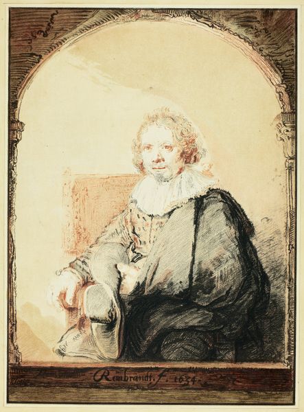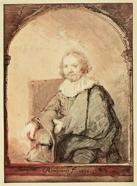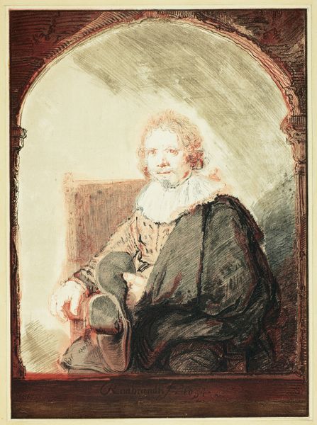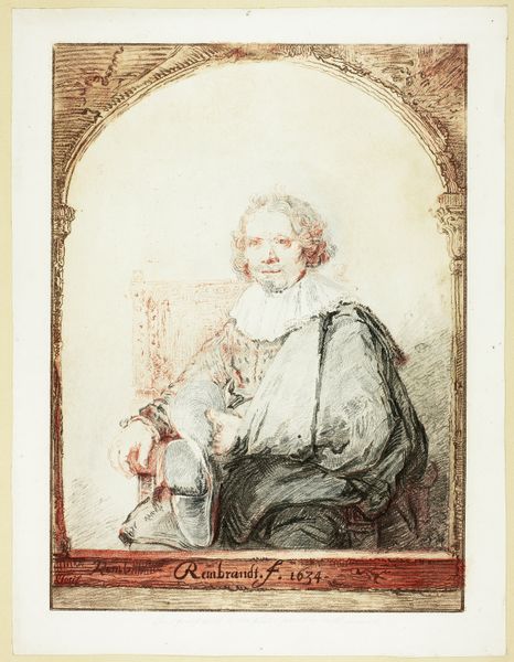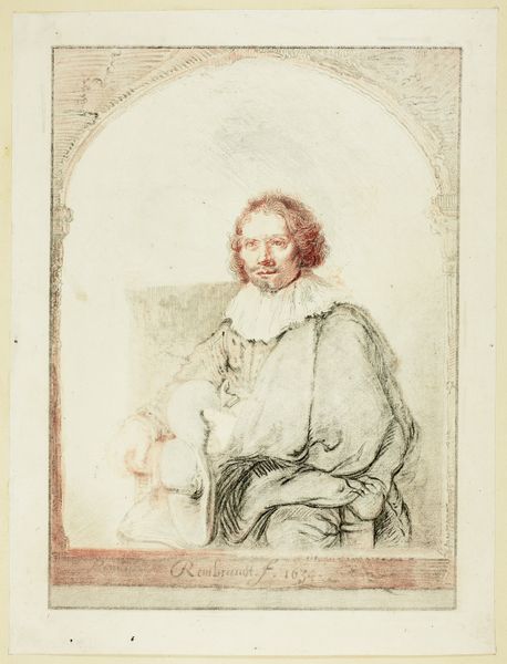 Editor: We're looking at "Portrait of a Man in an Arm Chair" from possibly 1821 by Christian Josi, a drawing in print using etching and engraving. It strikes me as quite unusual—almost like a caricature in its loose handling of form, but within this very formal setting. How do you approach a piece like this? Curator: First, we must set aside preconceived notions about the presumed intention of ‘caricature.’ Consider, instead, the pure formal relationships at play here. The arched framing device, a deliberate compositional element, contrasts sharply with the subject's slumped posture. Notice the deployment of line: a frenetic hatching to define shadow, versus the spare, almost tentative strokes delineating the face. Is this, perhaps, about contrasting states of being? Rest versus implied action? Editor: I see that contrast. The arch feels so defined, almost architectural, and the figure within is… collapsing, almost. Is the tension simply within the lines, or is there something more we should be observing? Curator: Let us focus on the material presence of the work itself. The density of the etched lines in the drapery, their almost palpable texture, draws the eye and creates weight. How does that visual weight interact with the empty space defining the subject's head? Is this perhaps less about individual character, and more about the visual problem of balancing form and void, density and ethereality? Editor: That makes so much sense! Looking at it purely from the formal perspective reveals an entirely different story than what I initially saw. It becomes more about the *how* than the *who.* Curator: Precisely. The formal arrangement speaks to the power of line, form, and composition – the essence of the image. It challenges us to consider the objective qualities of the artwork. Editor: It's amazing how focusing on just those intrinsic qualities reveals such unexpected tensions and relationships. I'll never look at portraiture the same way again!