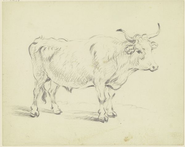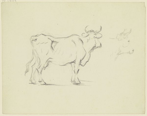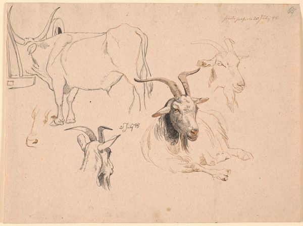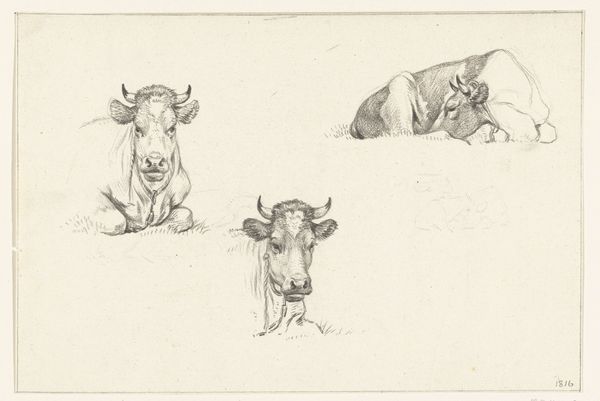 Josephus Augustus Knip created these three studies of Italian cattle with pencil on paper. The composition is simple, with three studies arranged on the page to maximize space and utility. Knip’s use of line and shading transforms simple sketches into studies that explore the form and texture of these animals. These studies engage with the broader tradition of animal portraiture, and with the use of preliminary sketches to prepare for more complex compositions. The variations in perspective offer an almost sculptural understanding, emphasizing volume and mass through the subtleties of light and shadow. Each drawing offers a different perspective, suggesting a deep investment in understanding and representing the animals naturalistically. Knip’s work here is an example of how the formal elements of drawing can converge to produce both an aesthetic and an intellectual engagement with the subject.