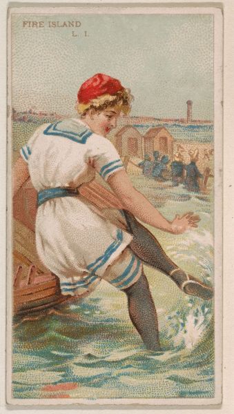 Curator: This watercolor print from 1889, part of the "Surf Beauties" series issued by Kinney Bros. Tobacco Company, is titled "Bar Harbor, Maine." What strikes you first about it? Editor: The visual elements give it a very dreamlike quality. The soft watercolor rendering and diffused light suggest a nostalgic idealization of leisure, far removed from the era's socio-economic tensions. The woman, idyllic in a way, projects this image of beauty tied to a specific locale. Curator: The symbolism is subtle but compelling. Water, classically a signifier of both emotional depth and transience, complements the figure as she gazes out towards it. The ribbons evoke feelings of both adornment, privilege, and perhaps restraint – tying back to Victorian ideals of women. Editor: Precisely, that connection to Victorian ideals cannot be ignored. The "Surf Beauties" series as a whole tells a tale of advertising intertwining with cultural aspirations and social hierarchies of that period. How intriguing to use an image so innocent and domestic on packaging related to such a potent consumer product, connecting smoking pleasure with upper-class lifestyle imagery. Curator: It's as if these images act as miniature societal mirrors. Notice the gaze directed towards the harbor and the ships sailing away; these could also signify departure, escape, and possibilities lying just out of reach. Consider what such imagery of movement implied within the constricted gender roles of the time. Editor: Indeed, they offer a glimpse into how industries subtly shape cultural perception. Cigarette cards functioned much like today’s digital ads, fostering cultural memory with layers of aspirations, beauty, and subtle suggestions. And yet, with the passage of time, we also inherit its dated politics regarding women's roles. Curator: When viewing works like "Bar Harbor, Maine", we begin to disentangle layers of meaning and trace those cultural currents. The more we look, the more we glimpse within ourselves through its cultural impact. Editor: Right, this close analysis reveals both the beauty and artifice, inviting us to understand and challenge our notions of art, advertising, and visual messaging today.