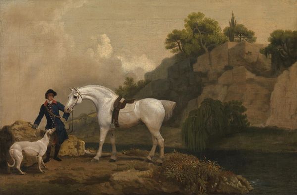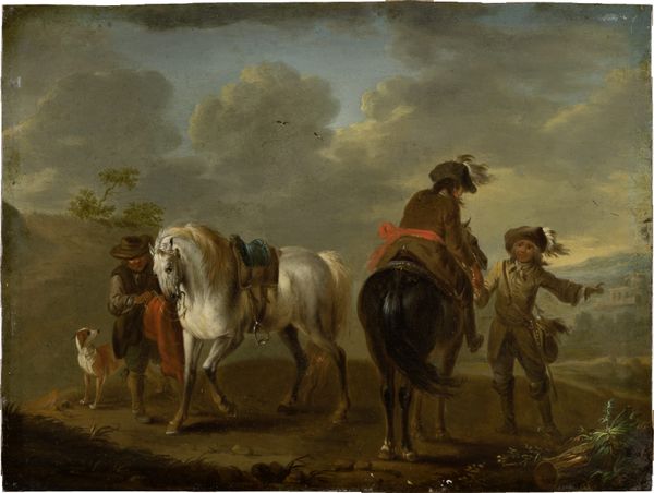 Curator: Welcome. We're standing before Thomas de Keyser’s "Portrait of a Horseman with two Dogs," created around 1660-1670. Editor: The overriding feeling here is tranquility. Despite being a portrait of someone who's evidently well-to-do, there’s an appealing quietness and stillness about it. Curator: It certainly projects an air of reserved confidence, doesn't it? Commissioned portraits like this during the Dutch Golden Age were about projecting status and authority, so the choice of setting is key. Landscape features significantly, underscoring the sitter’s relationship to the land. Editor: I am drawn to how this vista works. The dogs are definitely of a higher breed, sleek looking hounds for sport. It reinforces not only class and breeding, but that ever important connection between humans, nature, and animal companions, too. They stand out and, although quiet, create dynamism. Curator: Indeed, dogs are loaded with cultural baggage and, here, the painter uses the animal to suggest loyalty and possibly also the wealth afforded by leisure. A lot of Dutch portraiture shows a burgeoning wealthy merchant class who, in the prior generation, would never have been able to buy such ostentation. Editor: Yes, it’s fascinating to look at it through that lens. Horses, in particular, traditionally have served as potent symbols of control and nobility. Curator: De Keyser had some shrewd strategies here. You'll note the lighting almost spotlights the sitter's face, drawing your eye straight to that slightly aloof, but ultimately welcoming gaze. It's masterful, a calculated invitation into their world, but never intrusive. It is quite a balancing act! Editor: Balancing act indeed! He creates a very tangible atmosphere of harmony between man, animal, and the natural realm – suggesting perhaps, the sitter’s place within the social structure and perhaps in their own understanding of existence and legacy. Curator: So much more than a mere snapshot then, I feel that studying de Keyser here reminds us to read into the artwork as well as look at the artwork and understand its historical dimensions to give more cultural perspective. Editor: And looking beyond that initial presentation can help us decode both how these people wished to be seen, but what those visual shorthands meant, even then. A visual memory to learn and unpick!