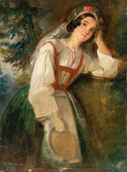 Narcisse-Virgilio Diaz painted "Bohémienne au tambour" in France, a period of significant social change and romantic interest in marginalized communities. The term "bohémienne" itself is loaded, historically used to refer to Roma people, often associated with a nomadic lifestyle and perceived exoticism. Diaz's painting participates in this romanticized vision, presenting the woman with a certain melancholic beauty, her gaze directed upward as if lost in thought. The tambourine is a cultural reference, evoking music, dance, and a sense of freedom. It's worth considering the socio-political context of mid-19th century France. The rise of industrialization and urbanization led to increasing social stratification, contributing to the fascination with those living outside mainstream society. Artists, writers, and intellectuals often sought inspiration in the lives of the so-called "bohemians," sometimes idealizing their independence but other times casting them as social outcasts. To fully understand this painting, one could research the representation of Roma people in French art and literature of the time, and also consider the institutional structures that shape these representations. We might ask: Does the painting challenge or reinforce existing stereotypes? What role did art institutions play in shaping public perceptions of marginalized communities?