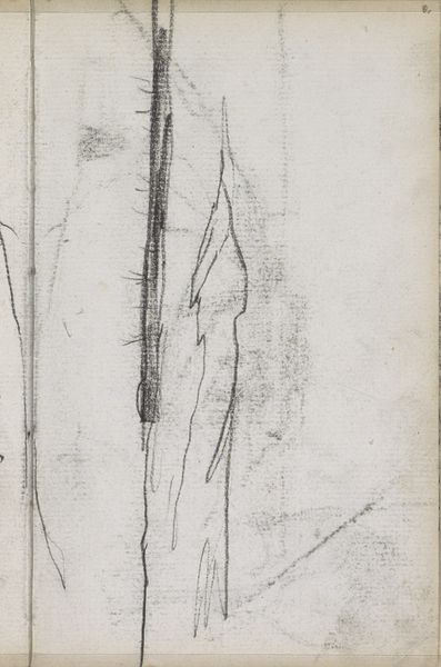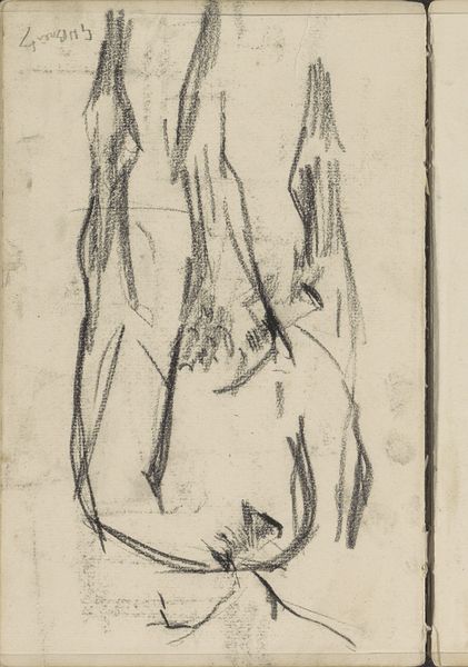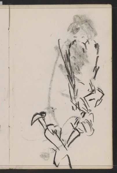 Editor: Here we have George Hendrik Breitner's 1893 pencil drawing, "Wijdbeens staande man," currently held at the Rijksmuseum. It strikes me as a very immediate, almost fleeting impression. What do you see in this piece, considering its raw, sketch-like quality? Curator: The primary element here is the stark line. The sketch is delineated using a swift hand, giving the subject, the ‘man standing with legs wide apart,’ an impactful stance despite its basic form. It lacks precise contours; instead, it provides merely the essence of volume. Observe how Breitner exploits the pure line to define mass and posture, without relying on shade or elaborate detail. What do you feel about this particular quality in his artistic approach? Editor: I guess I hadn’t thought about it that way, it does feel powerful! It feels so basic and reduced down to just the most important visual pieces. How do the limited artistic tools help us to think about the focus on shape and form? Curator: In its structuralist underpinnings, we note how Breitner uses a simple contrast of form and ground to compose this study. The positive and negative space plays off each other here. We see this dynamic in relation, and the use of minimalism actually accentuates it. With this type of form, do you think Breitner wants us to ask any questions about the state of modernity in Amsterdam at the end of the 19th Century? Editor: Hmmm... I'm not so sure, but he definitely highlights certain things through the way that the lines themselves show that something has been singled out to be observed in a world of everyday observations! Thank you, I've definitely been convinced to appreciate a more elemental lens! Curator: Indeed. It’s about paring down to reveal core structural concerns and a fascinating approach to observation in an art piece.